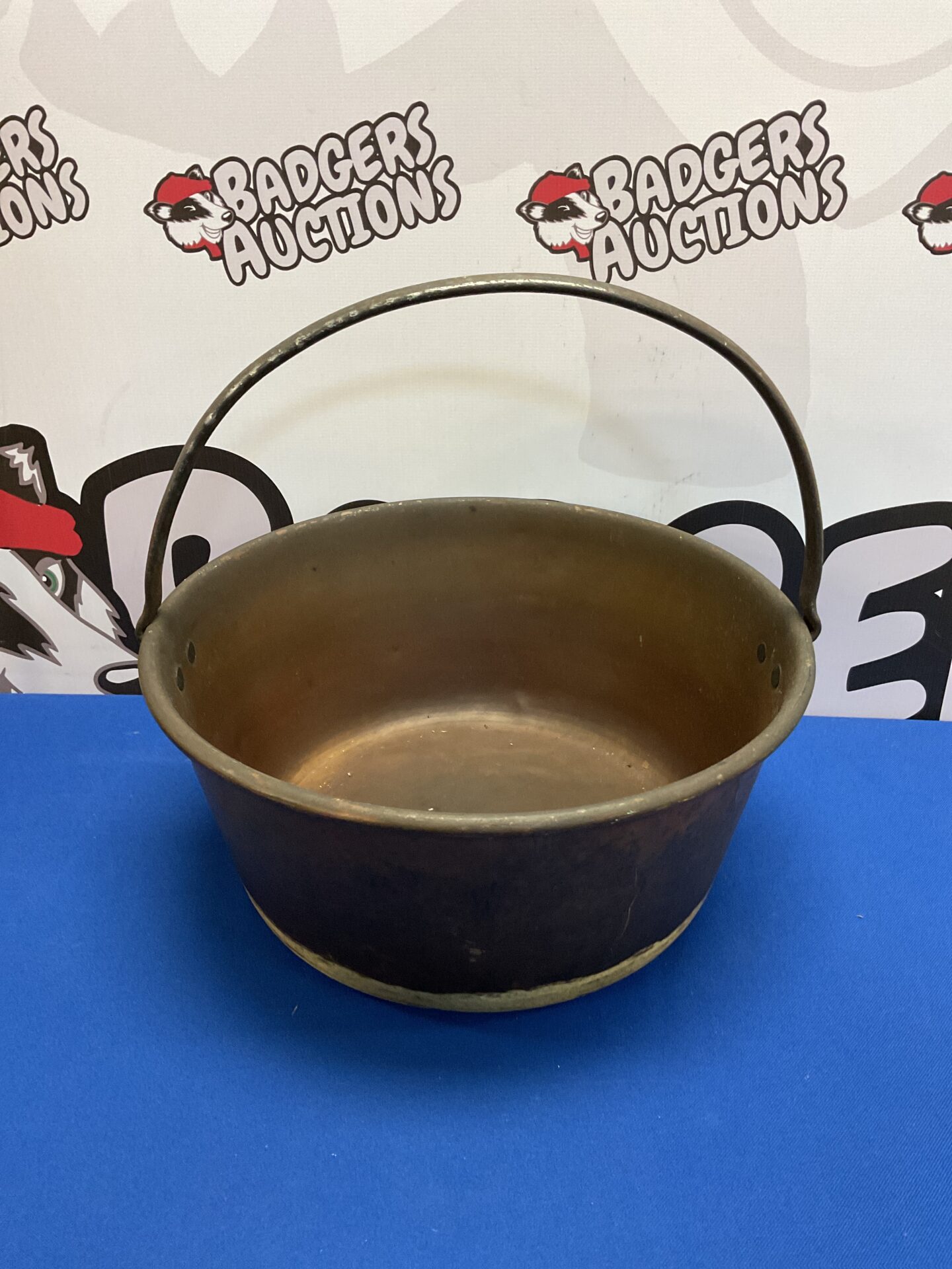 This antique copper jam pan with an iron handle is a beautiful piece of vintage kitchenware. Perfect for making preserves or as a decorative item, this pan showcases a lovely patina and robust construction. A charming addition to any kitchen or collection!