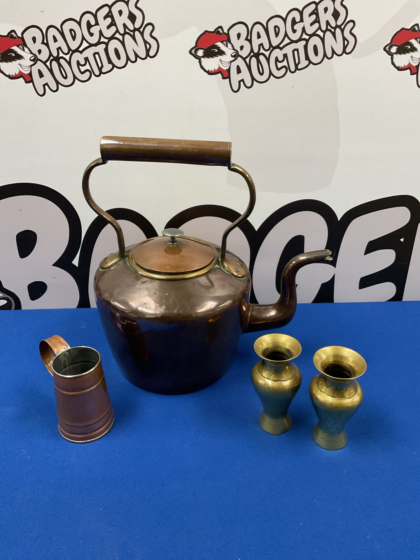 The copper kettle and jug show signs of age and use, with some patina and wear consistent with their age. The brass vases also exhibit some wear, but remain visually appealing. This set would be of interest to collectors of antique copperware, brass items, or those seeking unique decorative pieces for their home.