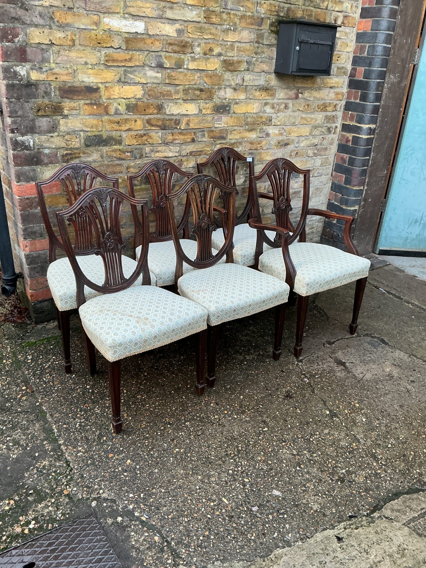This lot comprises four standard dining chairs and two carver chairs, crafted from rich mahogany. The chairs exhibit a classic Regency style, with elegantly curved backs and subtly carved detailing. Upholstered seats provide comfort, and the warm tones of the wood suggest a piece from the 19th century. These chairs would have originally formed part of a larger dining set, offering both functionality and a touch of sophistication to the dining experience.