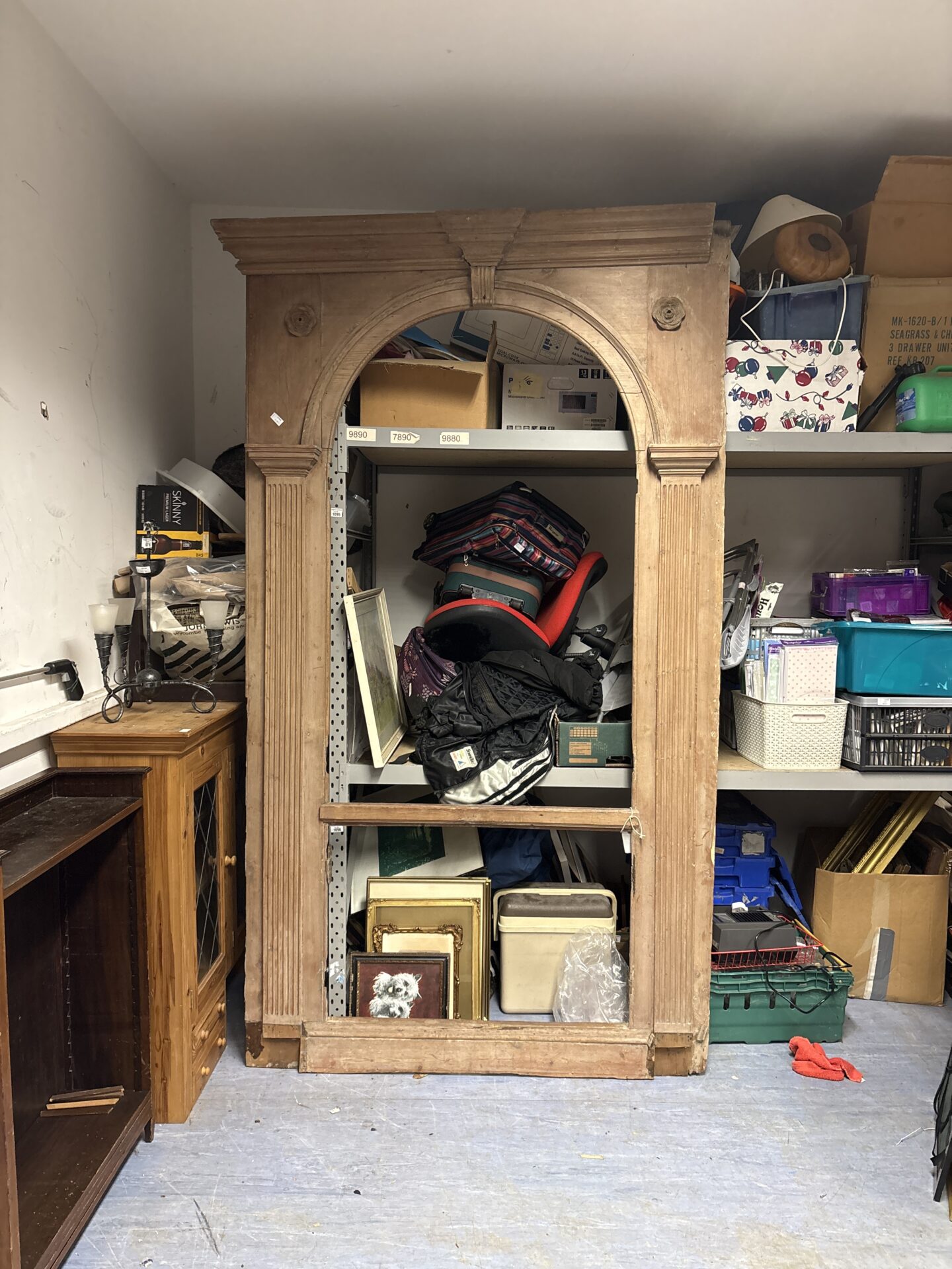 This striking antique door frame is a salvaged architectural element, originating from Wycombe Manorhouse. The frame features a classic arched design, constructed from solid wood, and exhibits the craftsmanship typical of its era. Its substantial size and ornate detailing suggest it once graced a grand entrance or significant room within the manor.