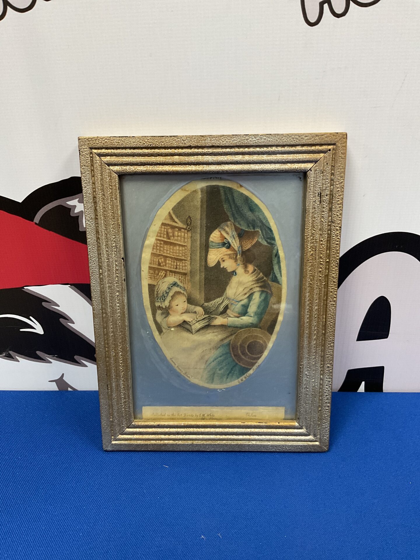 This is an antique print depicting a mother and child reading, created by Emma Grerve and printed by C.W. White. The print is executed on silk, showcasing a delicate and refined aesthetic typical of 19th-century engravings. The scene portrays a tender moment between a mother and child, rendered with fine detail and a gentle composition. This print exemplifies the artistic style prevalent during the period, focusing on domestic scenes and sentimental subjects.