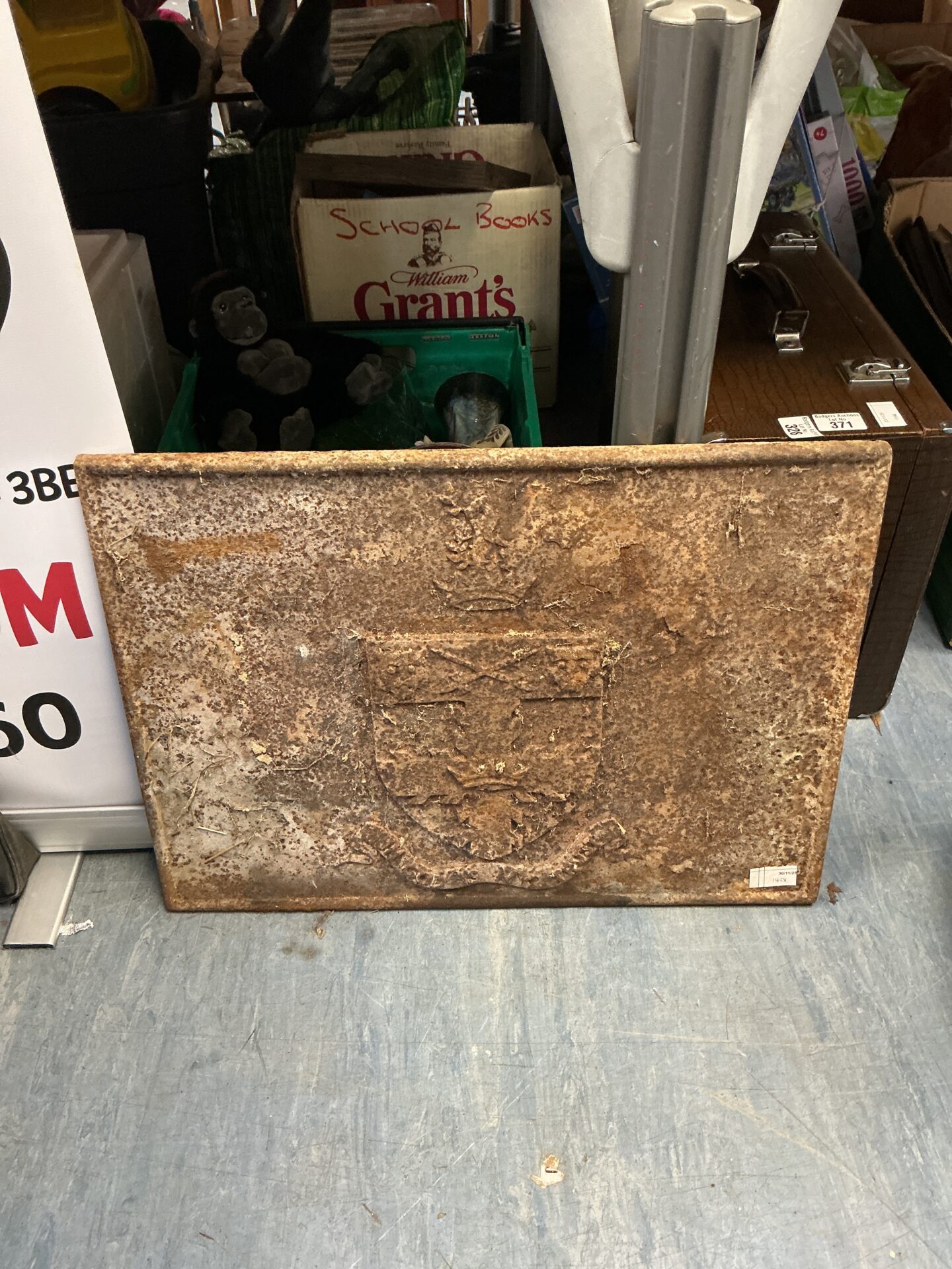 This is a substantial antique cast iron fireplace back, featuring a prominent shield crest design. The intricate detailing suggests a Victorian or Edwardian origin, likely intended as a decorative and functional element within a fireplace setting. The cast iron construction indicates durability and a quality of craftsmanship typical of the period, intended to withstand high temperatures and provide a visually appealing focal point for a room.