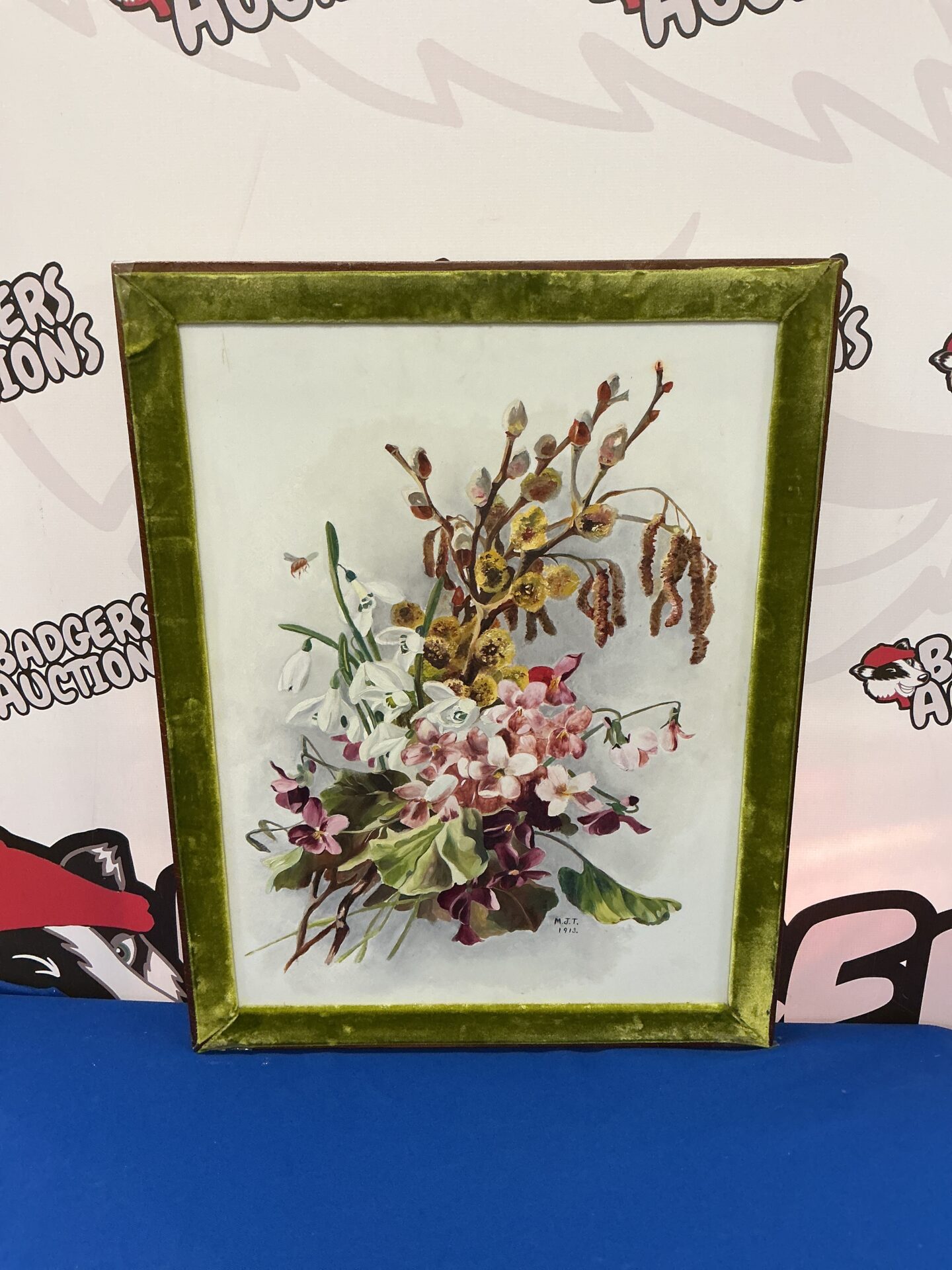 This is a fine antique oil on opaque glass floral study, dating to 1913. The painting depicts a detailed arrangement of flowers, with a bee delicately positioned amongst the blooms. The use of oil on glass creates a unique luminosity and depth, showcasing the artist’s skill in capturing the beauty of nature.