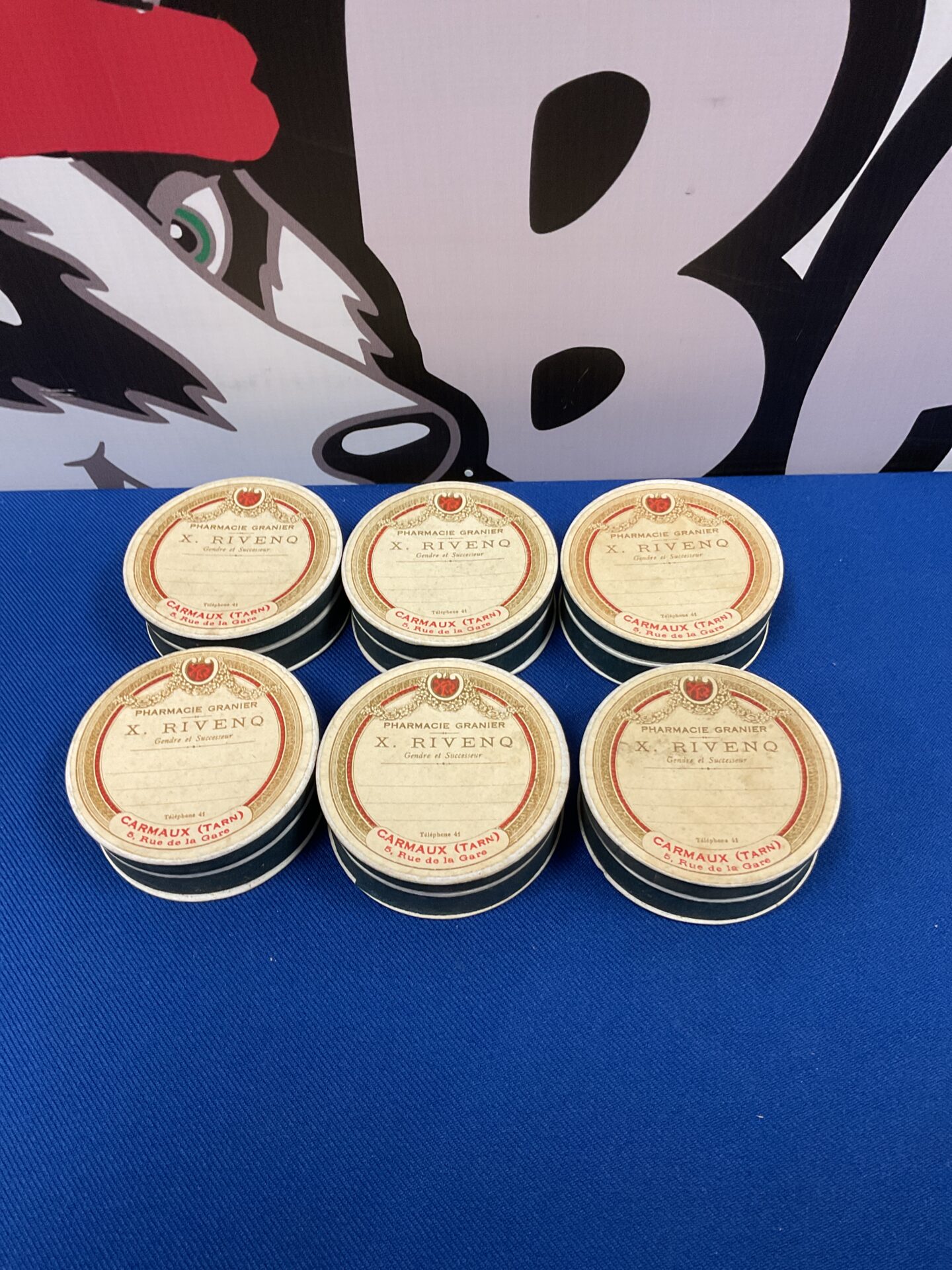 These are six antique French Pharmacie Granier pill boxes. Crafted from a durable material, these boxes were originally used in pharmacies to dispense medication. The boxes feature a classic design, typical of French apothecary items from the period, and are marked with the “Ph. Granier” branding. They represent a fascinating glimpse into the history of medicine and pharmaceutical practices.