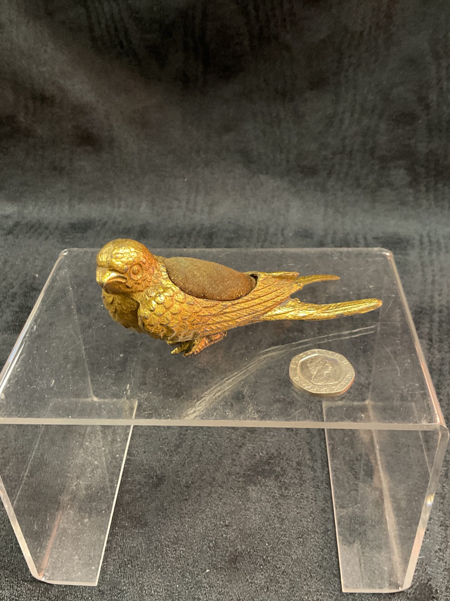The pincushion presents with age-related wear to the gilt bronze finish, consistent with its age and use. The fabric covering the pincushion surface is present, though shows signs of wear and fading. This piece is a desirable collectible for those interested in antique sewing tools, Victorian ephemera, or ornithological objects. The registration mark adds to its provenance and appeal for collectors.