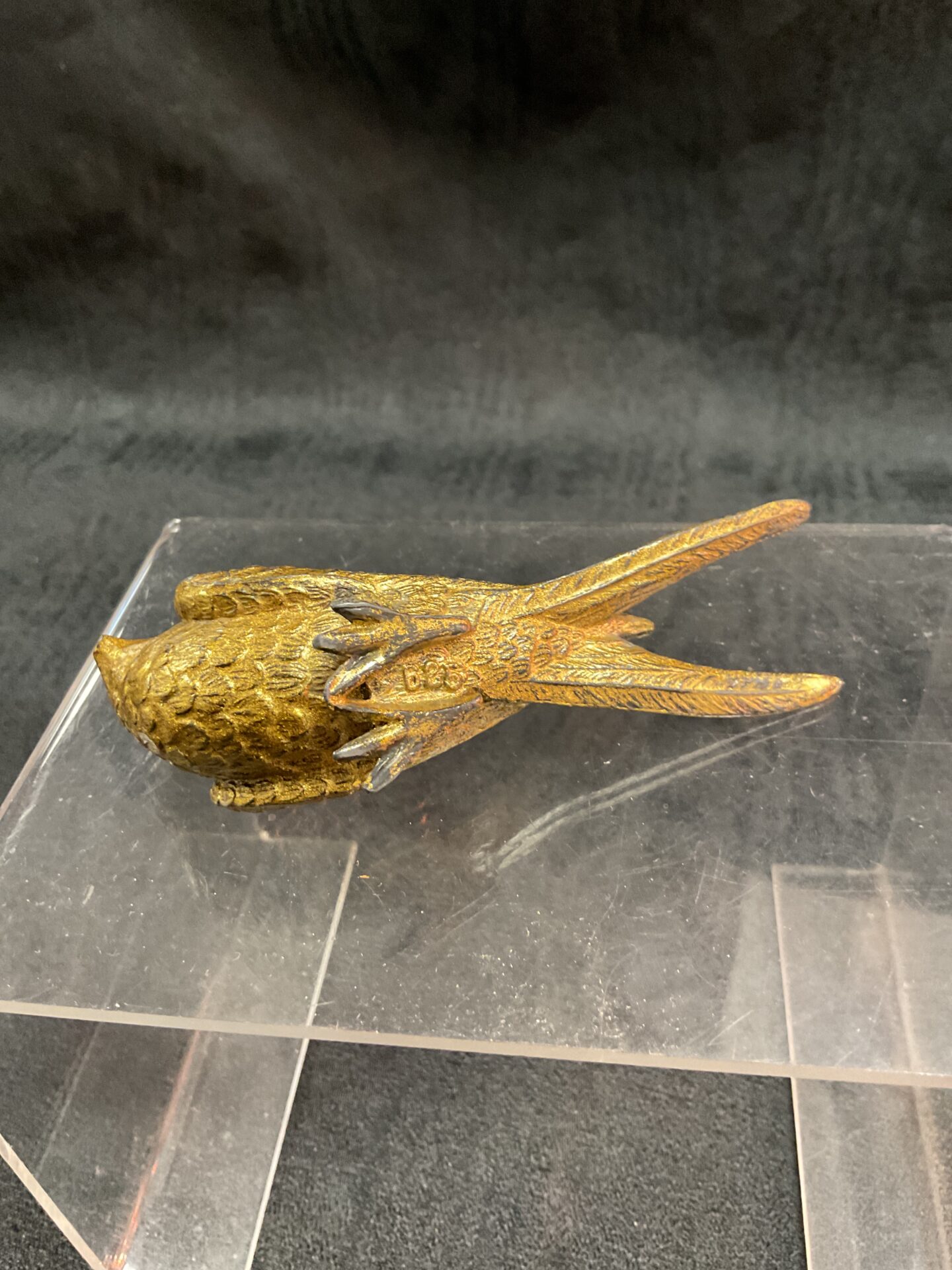 This is a charming antique gilt bronze pincushion, modelled as a swallow. The bird is beautifully detailed, with textured feathers and a realistically sculpted head. The pincushion is formed by the bird’s body, and it bears a registration number ‘625’ to the base, dating it to circa 1880. This piece would have been a functional and decorative item in a Victorian sewing kit.