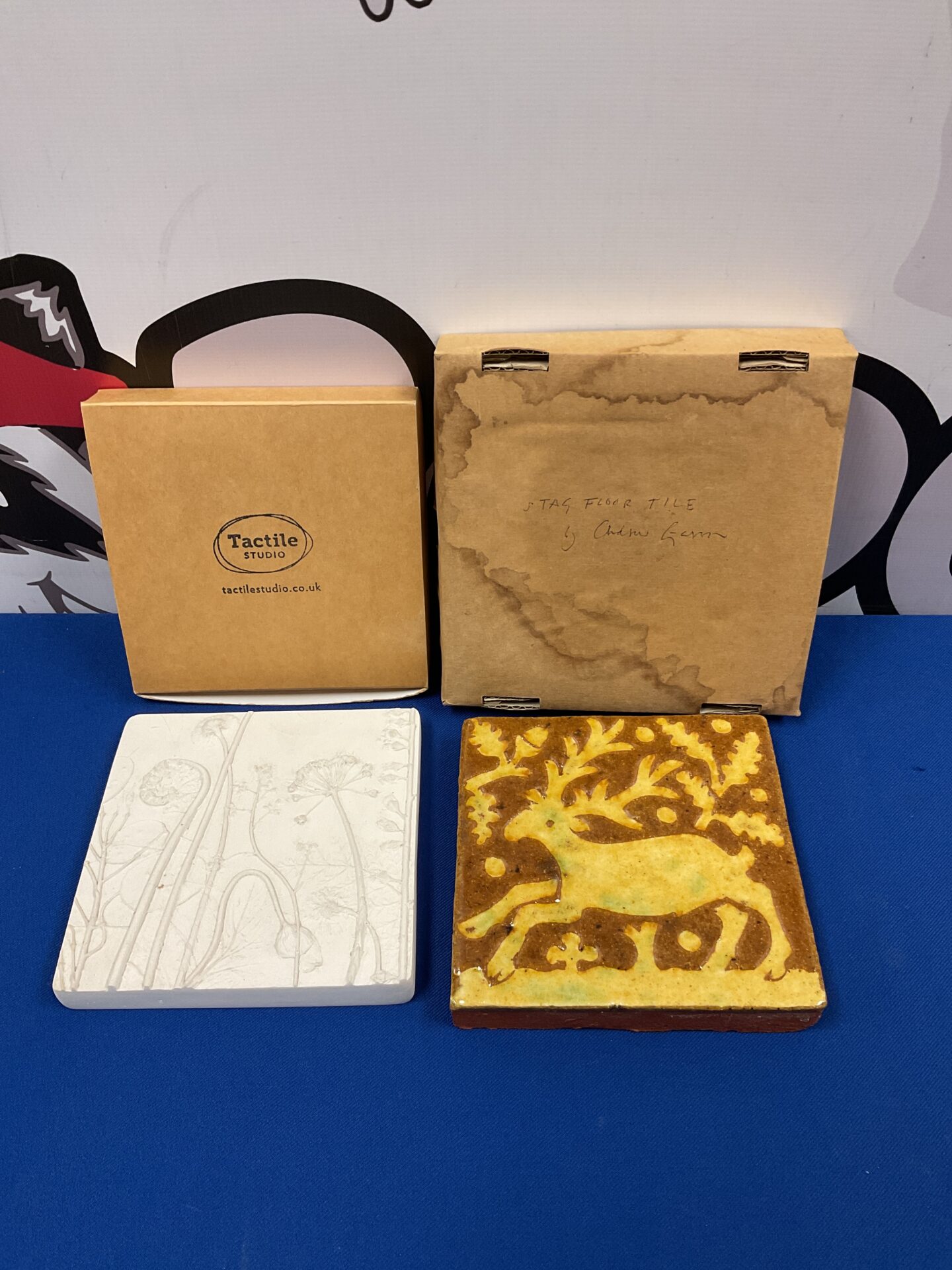 This lot comprises two antique ceramic tiles. One tile features a beautifully rendered stag, glazed to enhance its detail, and the other displays a floral motif. These tiles likely originated as decorative elements within a larger tiled surface, perhaps a fireplace hearth or hallway floor, and showcase the craftsmanship of a bygone era. The tactile studio mark suggests a later appreciation or curation of these vintage pieces.