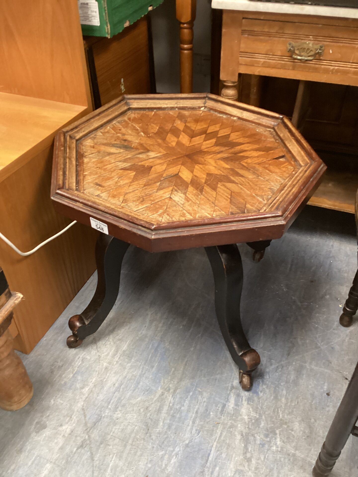 The table is in good antique condition, with expected wear consistent with age and use. The marquetry remains largely intact, and the legs are sturdy. This table would be a wonderful addition to a collection of antique furniture or a unique focal point in a period-inspired interior. Its quality and aesthetic appeal make it a desirable piece for collectors and enthusiasts alike.