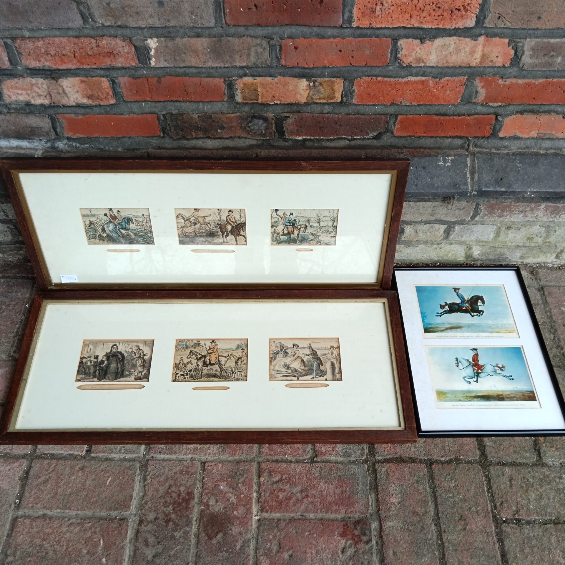 These prints exhibit signs of age and wear consistent with their antique status. There may be some foxing, minor blemishes, or slight fading, which adds to their character and authenticity. These prints would be of interest to collectors of antique prints, equestrian enthusiasts, or those seeking unique decorative pieces with historical significance. The framed presentation makes them ready for display.