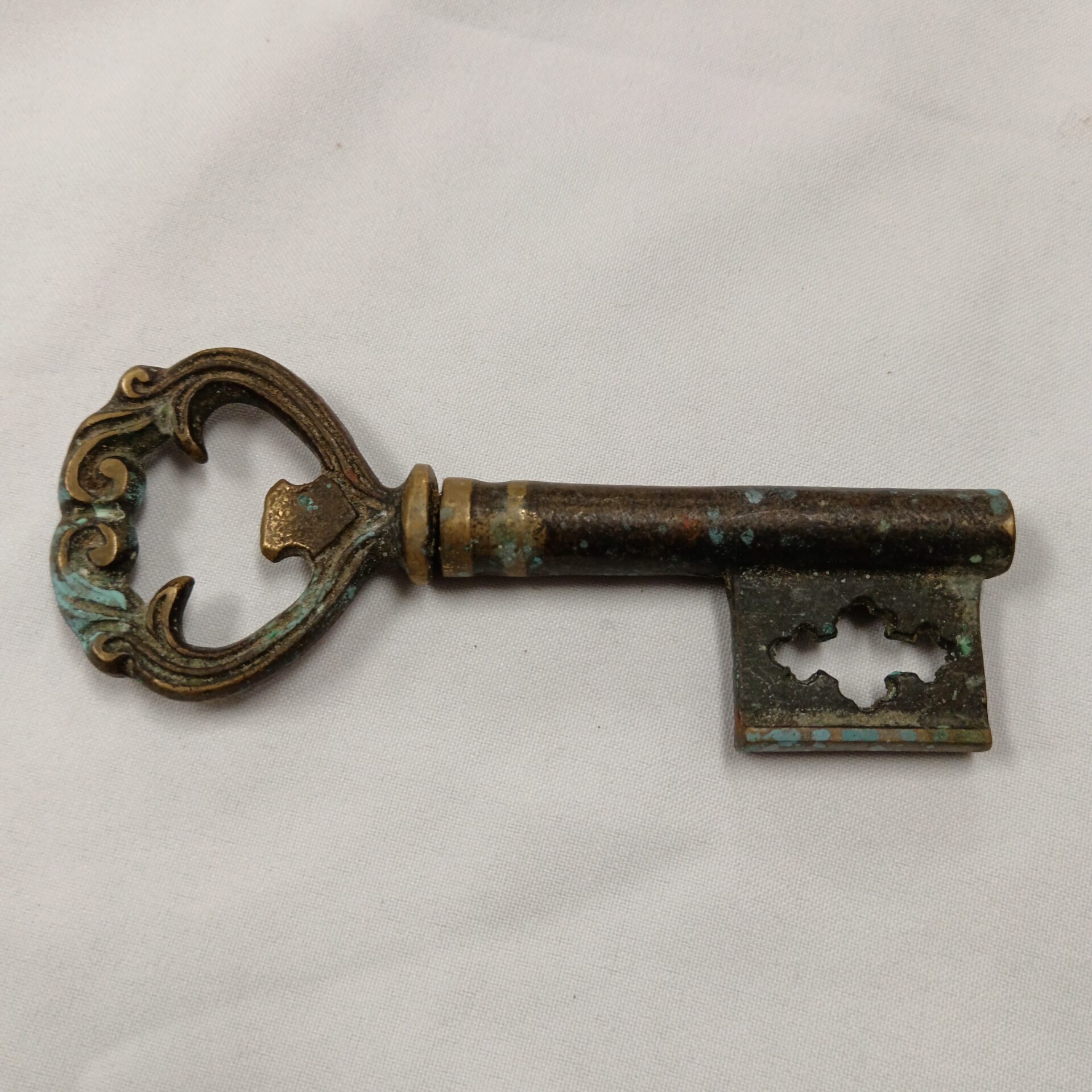 This intriguing item is an antique corkscrew cleverly disguised as a key. Crafted from metal with a darkened patina, it features a detailed key head that conceals the worm mechanism. The design is both functional and decorative, suggesting it was intended to be displayed as well as used. This unique corkscrew would have been a conversation starter at any gathering.