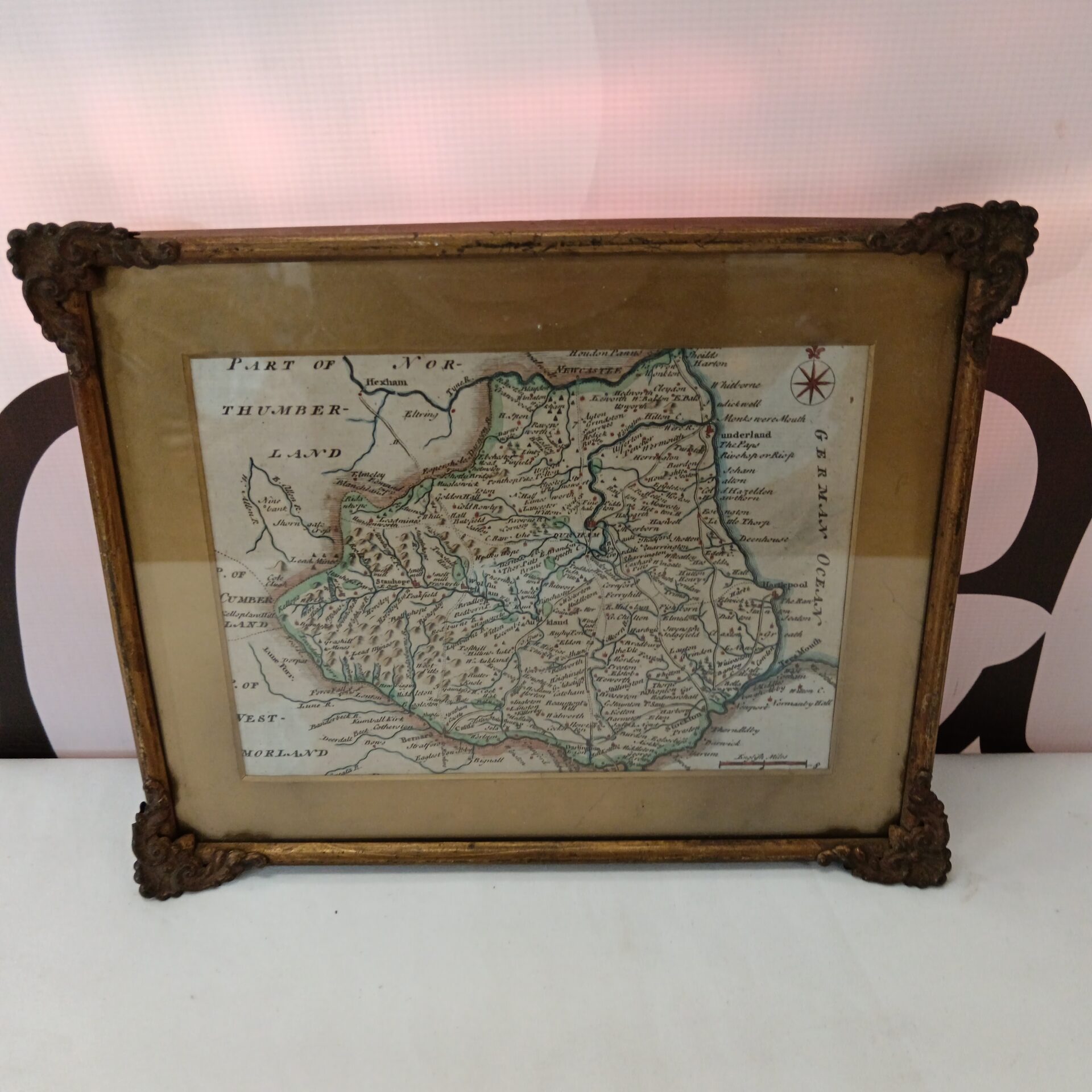 This is an antique map depicting a portion of Durham county, beautifully presented within an ornate brass frame. The map showcases detailed cartography typical of the period, with hand-drawn features and a classic aesthetic. The brass frame adds a touch of elegance and provides a secure housing for this historical piece, enhancing its display potential.