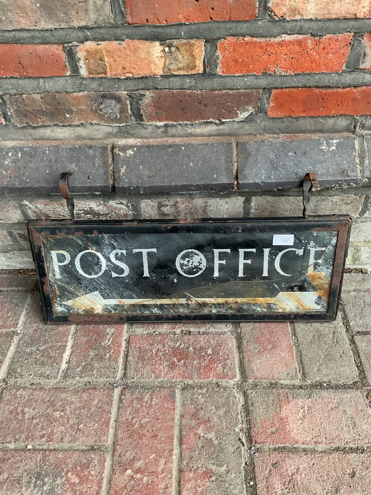 The sign exhibits signs of age and wear consistent with its antique status, including some chipping to the enamel and surface rust on the iron frame. These imperfections contribute to its authentic character and tell a story of years spent exposed to the elements. This piece would be a fantastic addition to a collection of vintage signage, postal memorabilia, or rustic décor, and is sure to be a conversation starter.