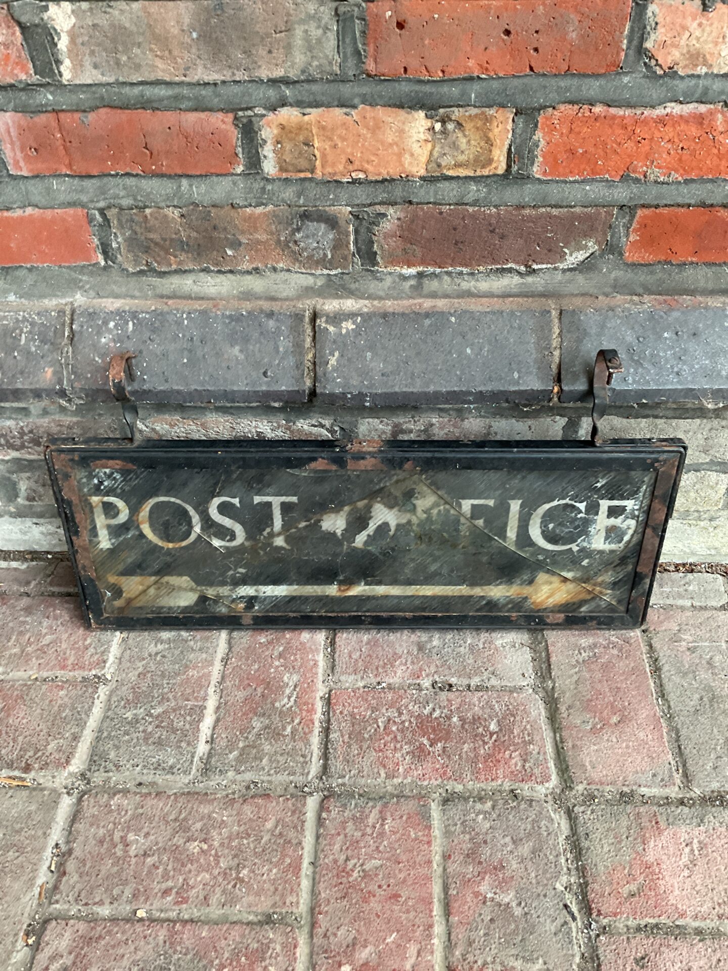 This striking antique sign once marked the location of a bustling post office. Constructed with a robust wrought iron frame, the sign features beautifully aged enamel panels displaying the words “POST OFFICE” in bold lettering. The double-sided design ensured visibility from multiple directions, making it a functional and prominent fixture in its original setting. The sign’s weathered appearance and classic design evoke a sense of history and nostalgia.