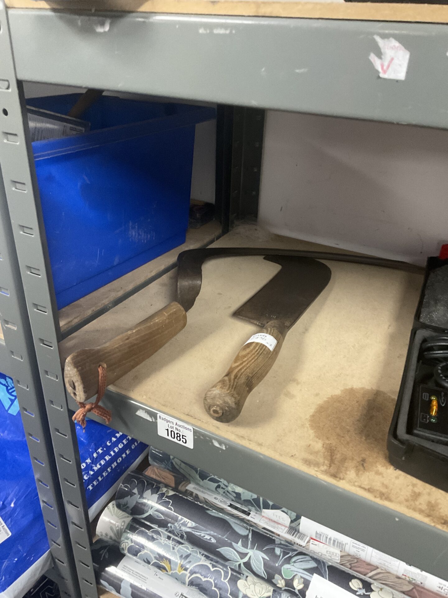 The scythe and bill hook show signs of age and wear consistent with their use as working tools. The blades exhibit patina and may require sharpening or restoration. This lot would appeal to collectors of antique farm tools, gardening enthusiasts, or those interested in historical agricultural practices.
