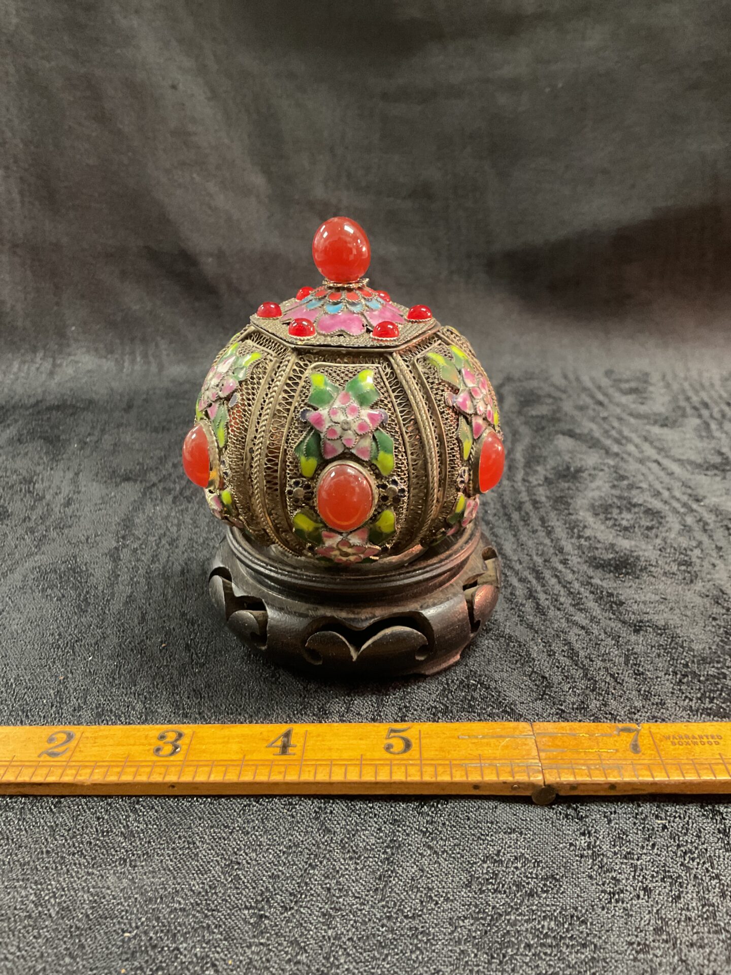 The snuff bottle exhibits signs of age and wear consistent with its antique status, including minor surface scratches and patina to the silver. Despite these characteristics, the filigree remains largely intact, and the stones retain their colour and lustre. This piece would be a valuable addition to a collection of antique snuff bottles, or for someone interested in fine silverwork and Eastern art.