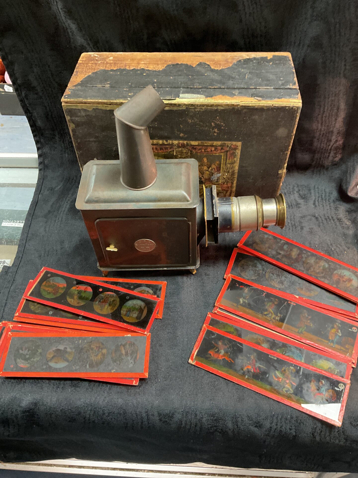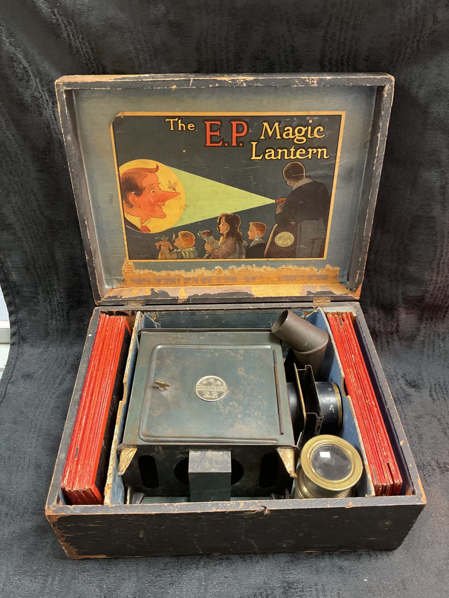 873 Antique The E P Magic Lantern In Original Box With 23 Original Colour Glass Slides