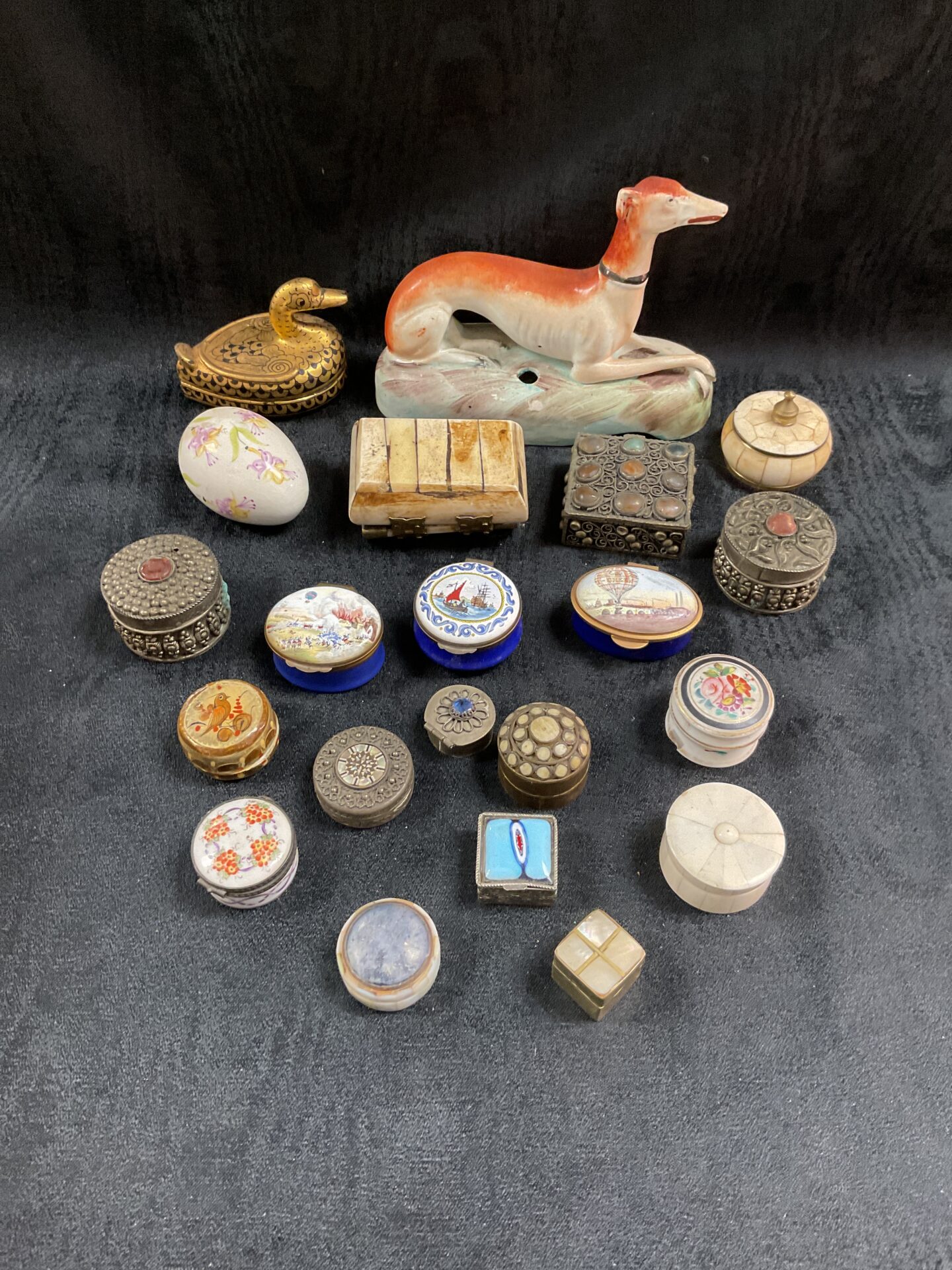The trinket pots exhibit varying degrees of wear and patina consistent with their age. Some may display minor chips, scratches, or enamel loss, adding to their character and authenticity. Collectors will appreciate the diversity of styles and materials within this collection, making it a desirable addition to any assemblage of antique miniatures or decorative objects. This collection is perfect for enthusiasts of vintage collectibles and those seeking unique pieces to enhance their home décor.