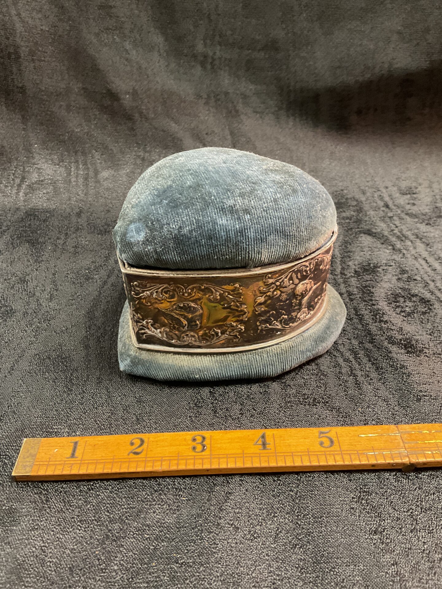 The box shows signs of age and wear, consistent with its antique status. The velvet exhibits some fading and minor wear, while the silver band displays a lovely patina. Despite these signs of age, the box remains a delightful example of Victorian/Edwardian craftsmanship and would be a welcome addition to any collection of antique boxes or jewellery storage items.
