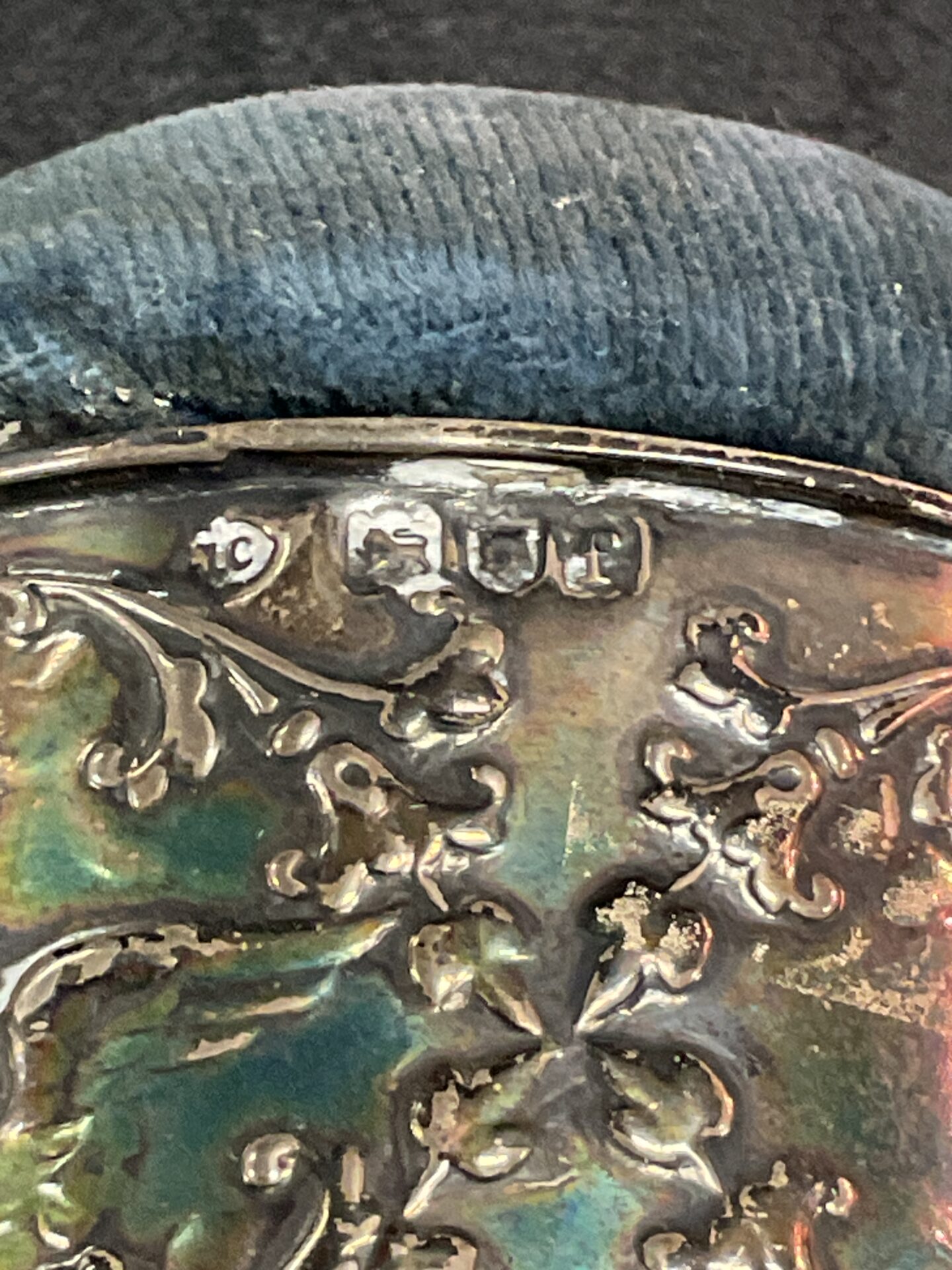 This charming jewellery box features a heart-shaped form, covered in a pale blue velvet. A band of hallmarked silver encircles the box, adding a touch of elegance and sophistication. The silver band is intricately decorated with embossed floral and foliate designs, suggesting a Victorian or Edwardian origin. This box would have been used to store precious jewellery and small keepsakes.