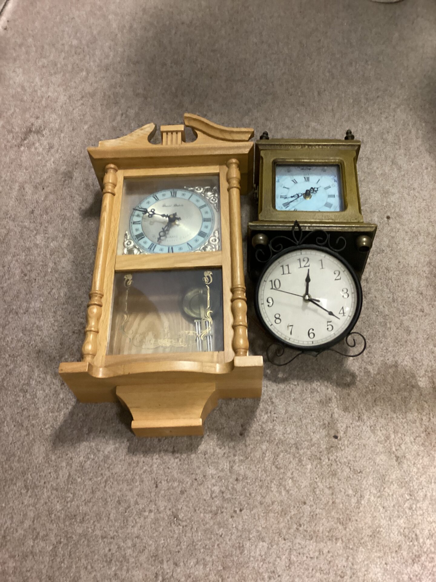 This antique wall clock presents a classic design, likely dating from the mid-20th century. The clock features a wooden case with a decorative face, and appears to be a traditional time-telling device intended for wall mounting. Its style suggests a period aesthetic, potentially fitting into a variety of interior design schemes.