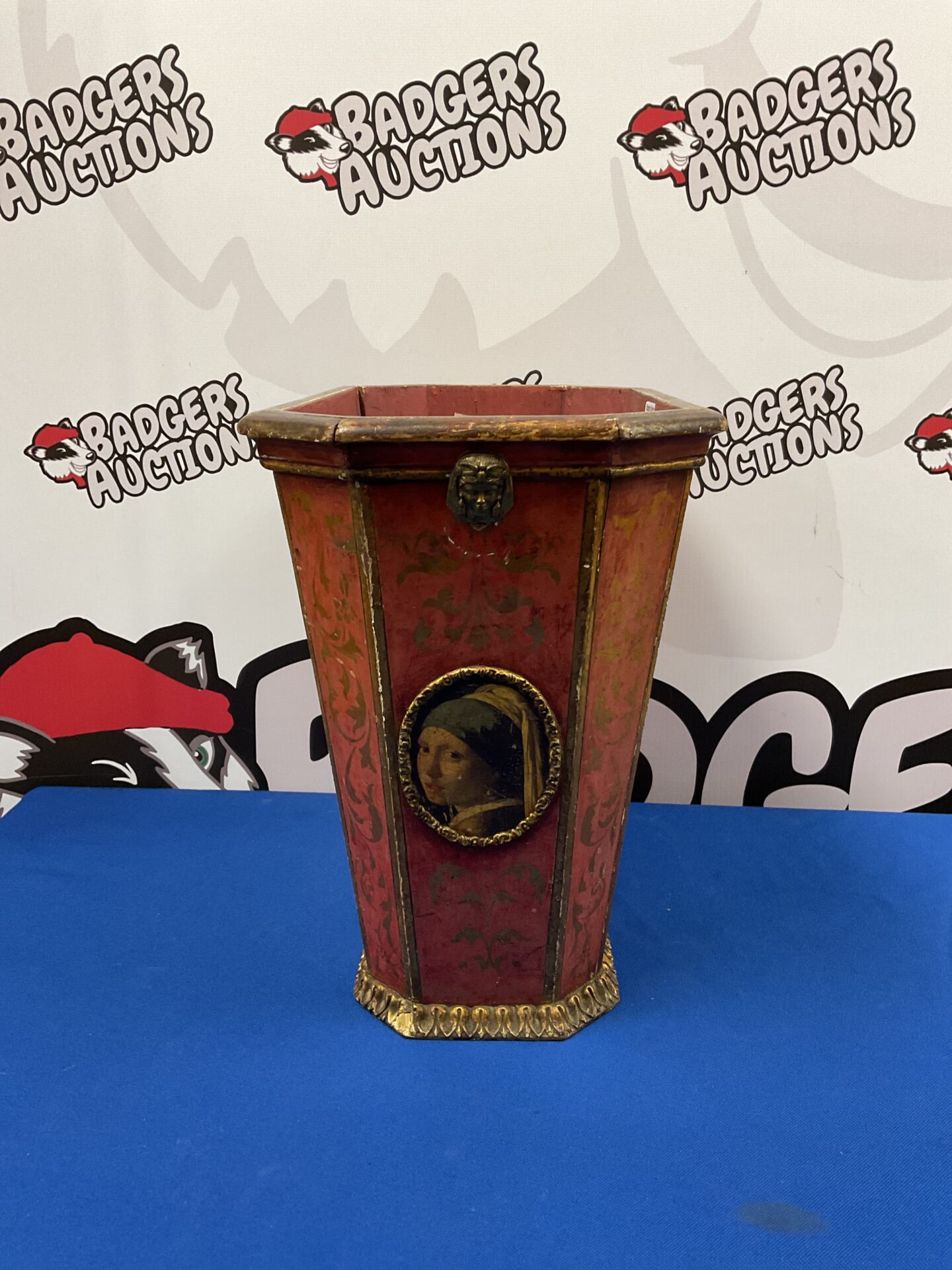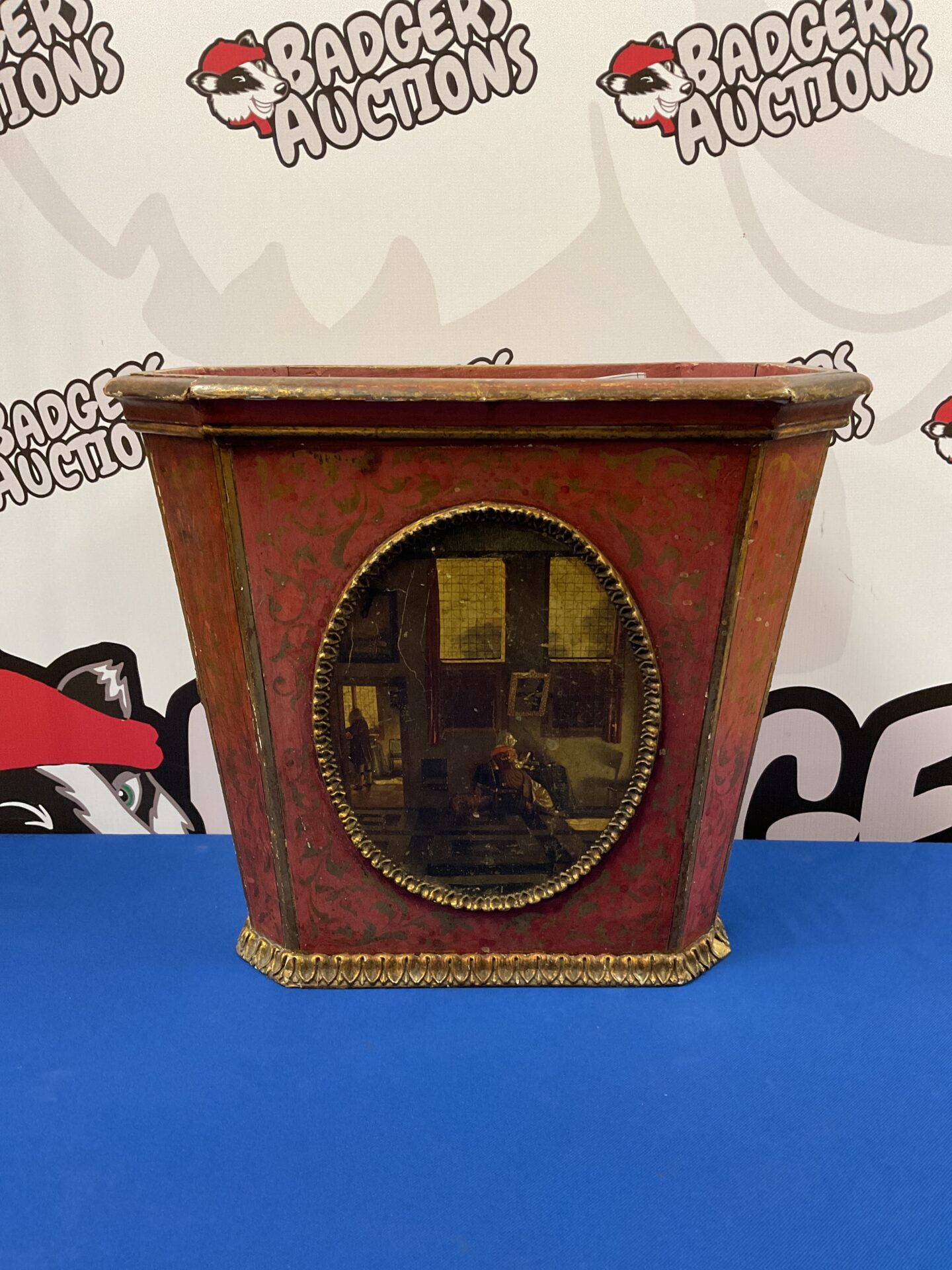This antique waste paper basket presents a charming decorative element, likely dating from the Victorian era. The wooden construction is painted in a rich red hue, accented with gilded detailing around the base and top rim. A central oval panel showcases a classical scene, depicting figures within an interior setting, adding a touch of historical elegance to this functional piece.