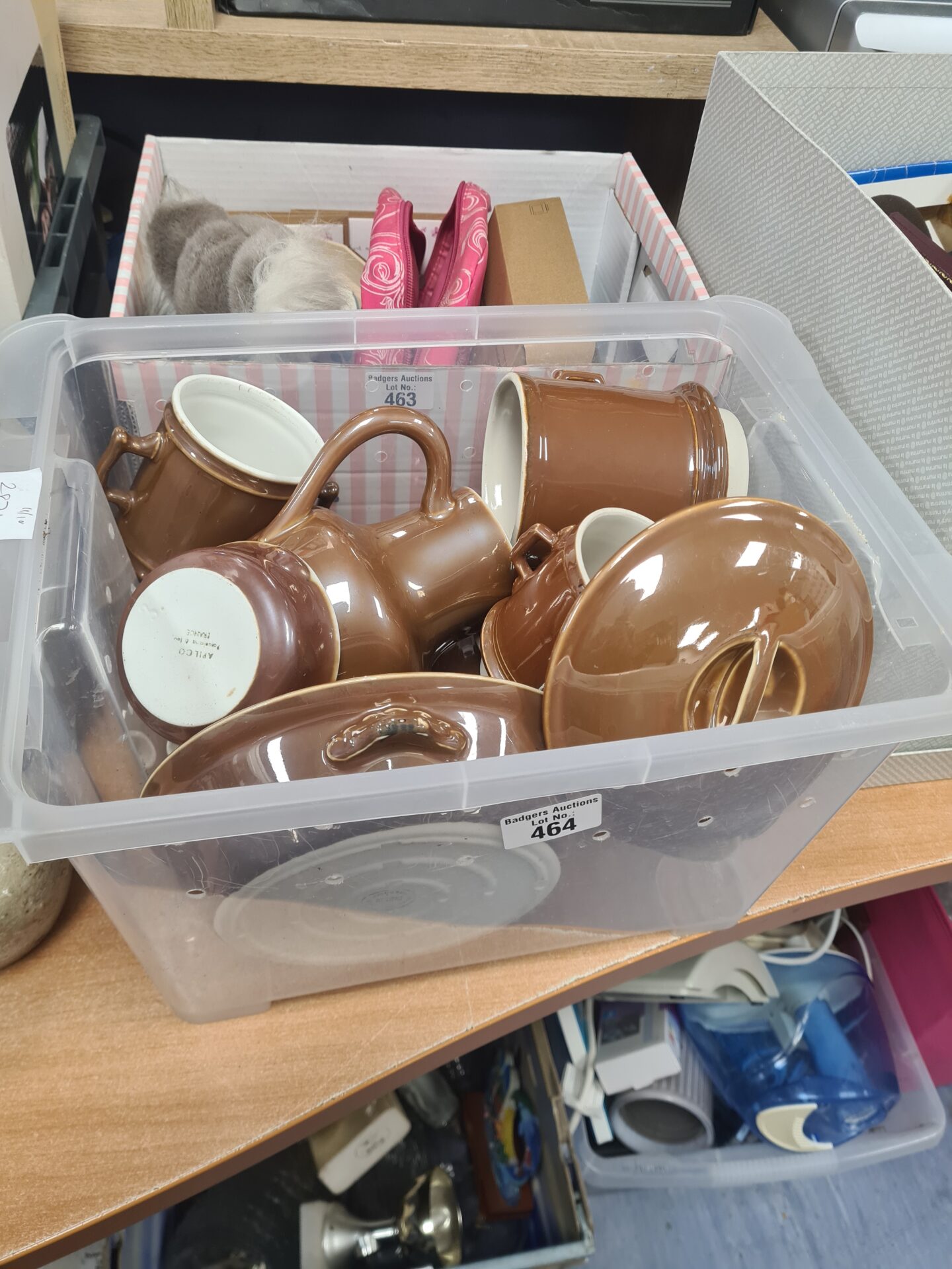 This is a charming collection of Apilco pottery, featuring a variety of pieces in a rich brown glaze. The set includes cups, saucers, and a larger serving piece, likely intended for restaurant or hotel use. Apilco is a renowned French pottery manufacturer known for its durable and stylish designs, and this set exemplifies their classic aesthetic. The pieces are marked with the Apilco stamp, confirming their authenticity and quality.