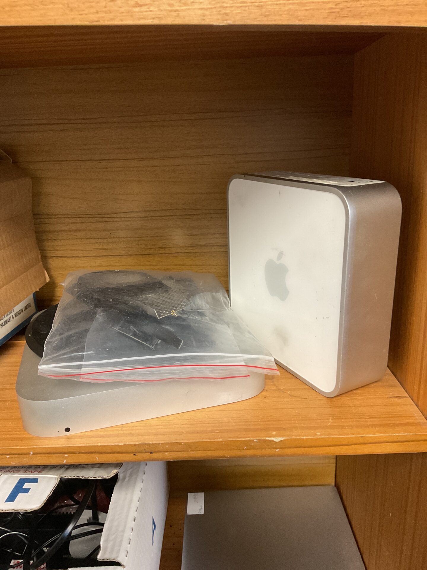 One of the Mac Minis powers on, however it has a broken fan. The other is offered for spares and repairs, with no guarantee of functionality. These units may appeal to collectors of vintage Apple computers, or those seeking parts for existing machines.