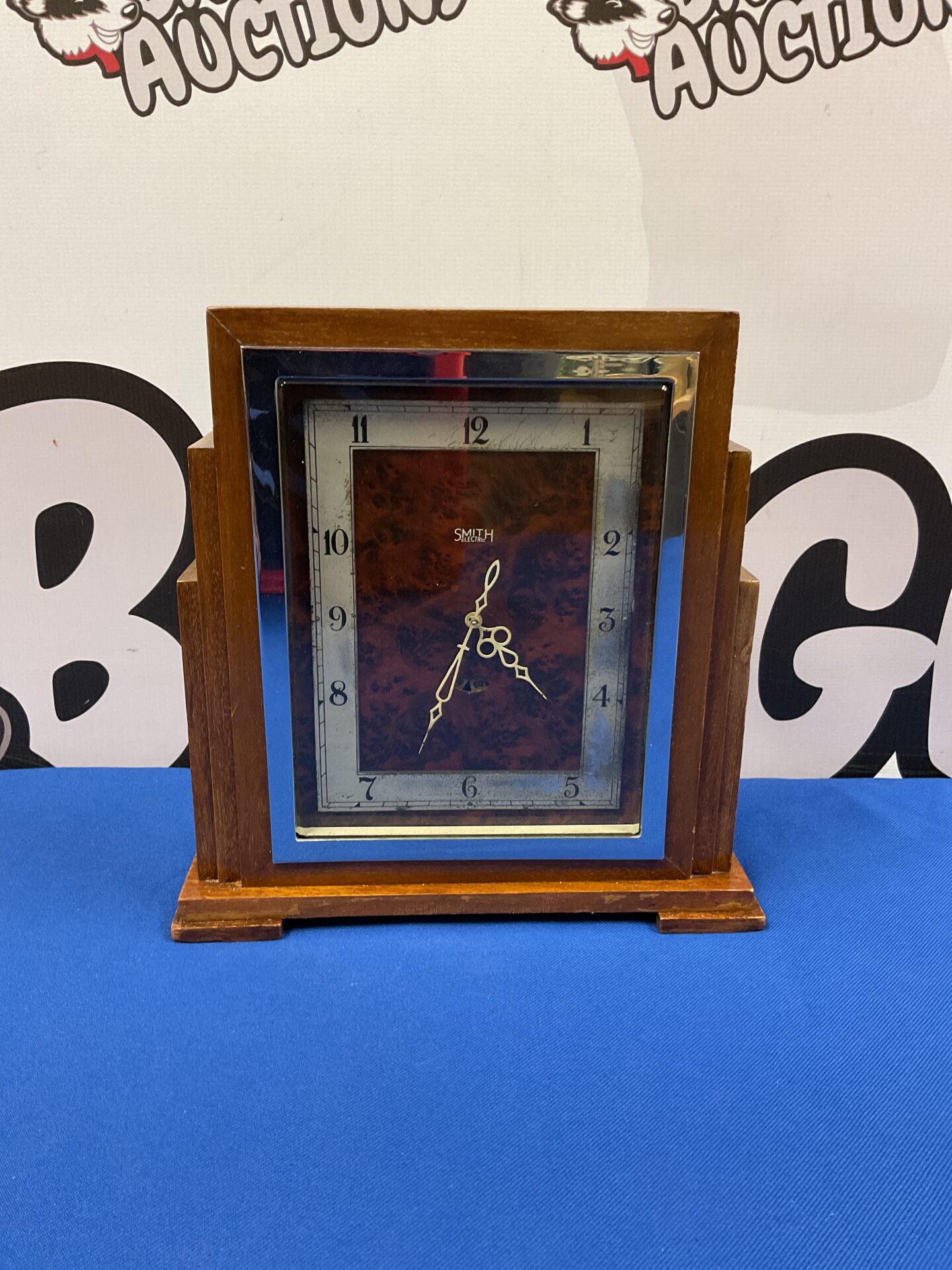 This is a striking Art Deco electric clock, manufactured by Smith. The clock features a classic stepped case design typical of the Art Deco period, with a cream dial and black numerals. The clock’s design embodies the streamlined aesthetic of the 1930s and 1940s, making it a beautiful and functional addition to any home.