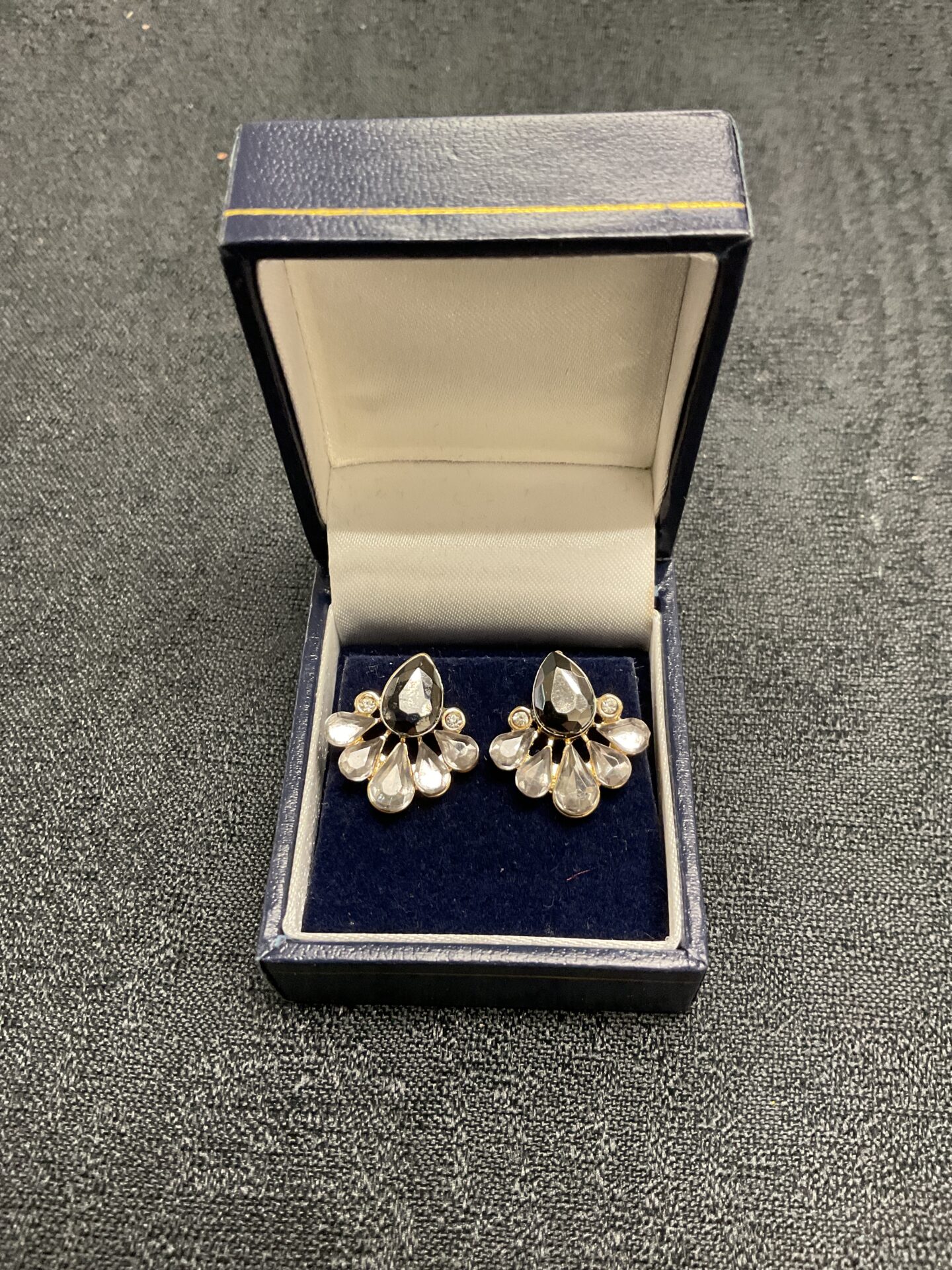 These earrings appear to be in good condition, displaying the expected wear consistent with their age. They would be a desirable addition to a collection of vintage jewellery, particularly for enthusiasts of Art Deco design. The combination of sapphire and Whitestone creates a striking visual appeal, making them a statement piece for any occasion.