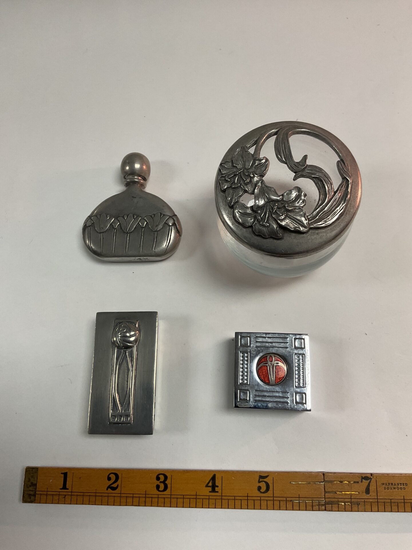 This pill pot exhibits signs of age and wear consistent with its antique status. While the glass interior remains intact, the metal exterior may show minor imperfections or patina, adding to its character. This piece would appeal to collectors of Art Nouveau objects, antique apothecary items, or those seeking a unique and decorative addition to their collection.