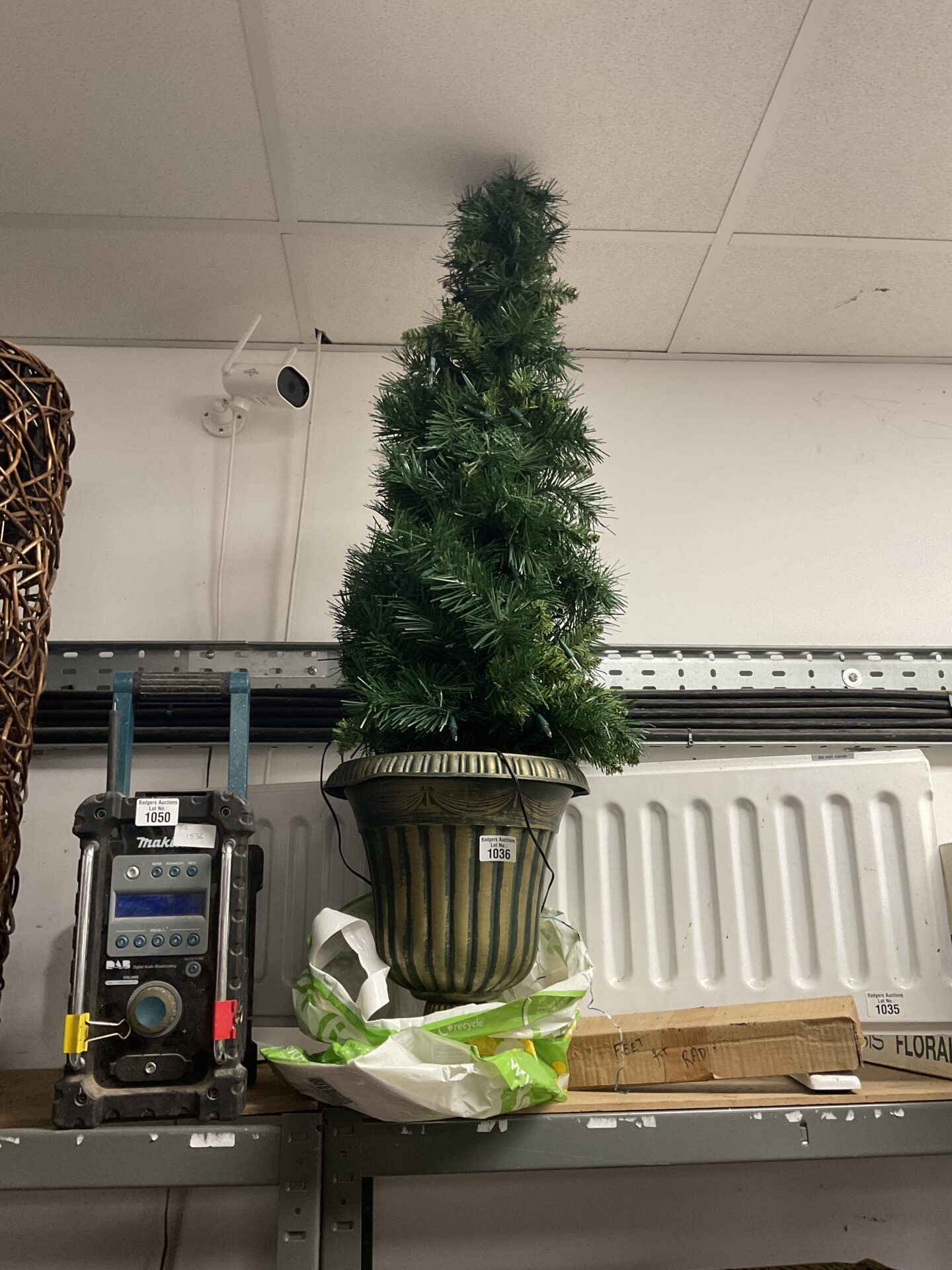 This artificial Christmas tree with urn appears to be pre-owned. While the tree and urn show signs of previous use, they remain suitable for display. This piece may appeal to collectors of vintage holiday decorations or those seeking a unique and compact festive display.