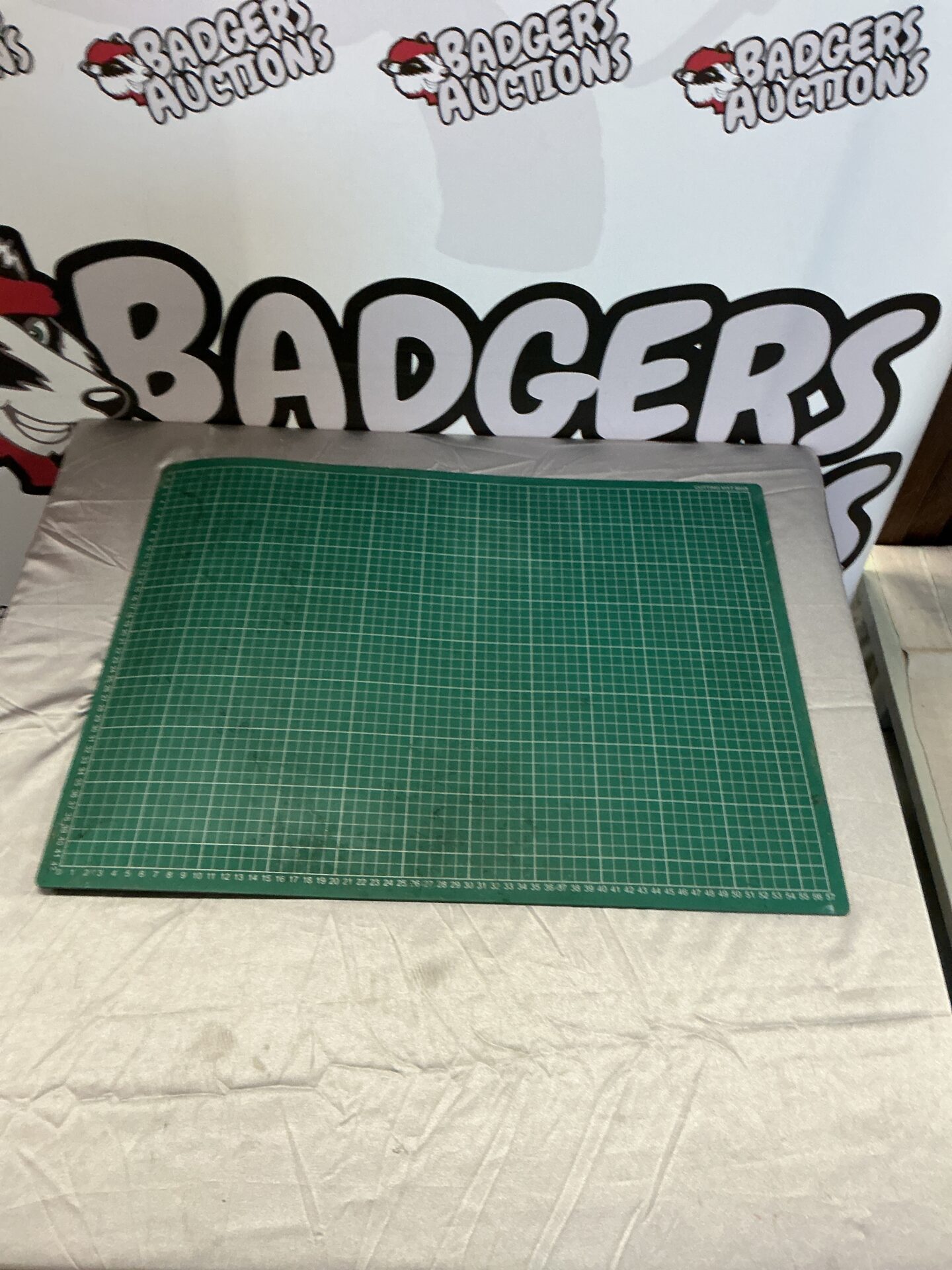 This cutting mat shows signs of use, with some visible surface wear and minor scoring from cutting tools. Despite this, it remains fully functional and suitable for continued use. It would be a useful addition to a crafting studio or workshop, offering a dedicated and protective surface for precision work.