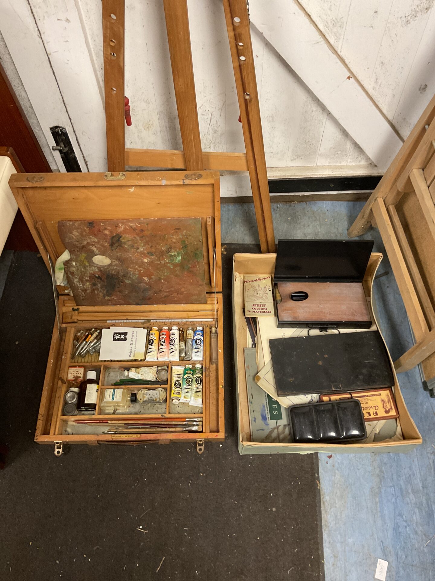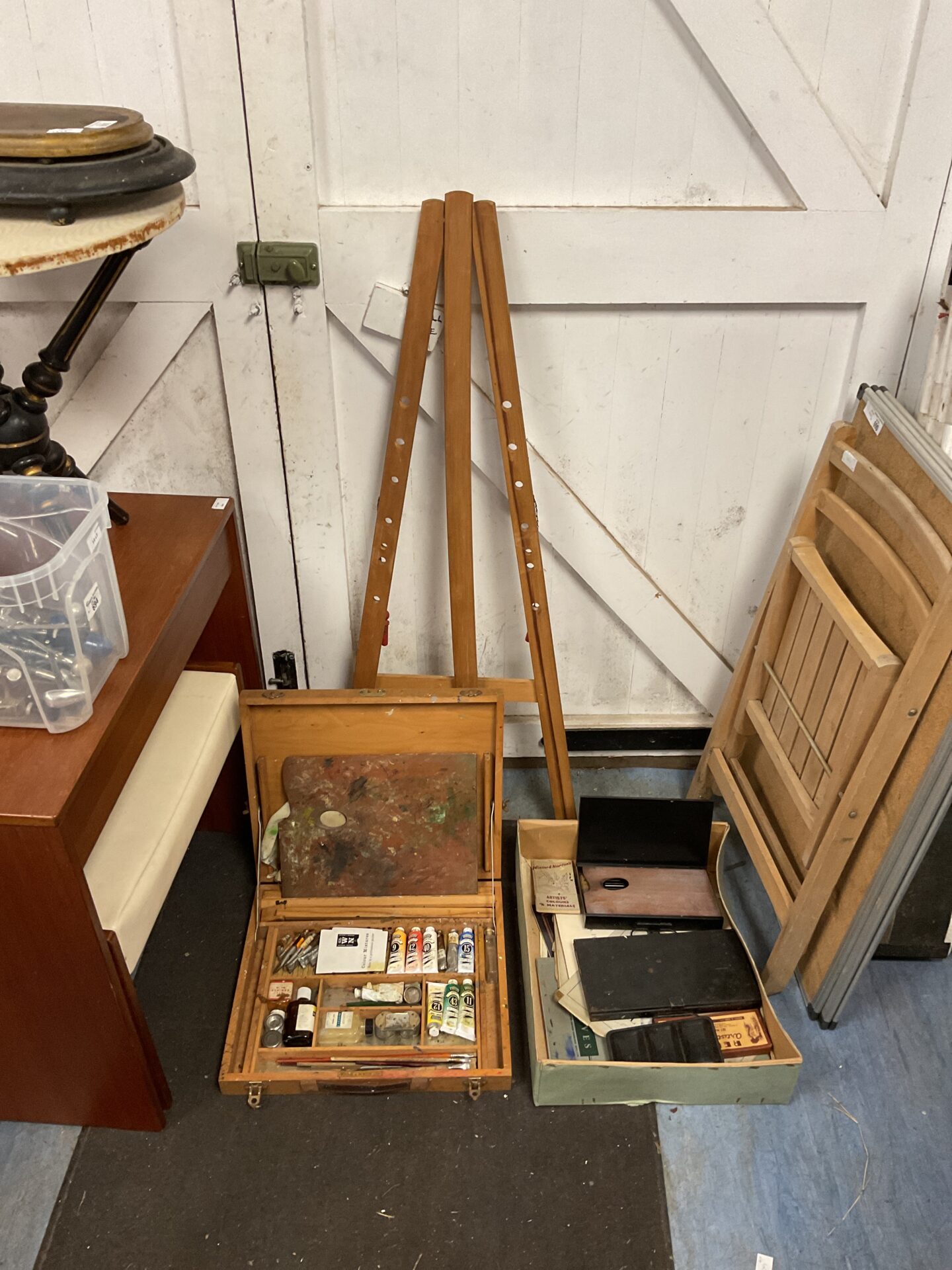 The easel and materials show signs of use and age, with some wear and paint residue visible. The wood exhibits a patina consistent with age and handling. This lot would appeal to artists seeking a vintage studio setup, collectors of art equipment, or those interested in restoring a piece of artistic history. The presence of Windsor & Newton branding adds to its collectibility.