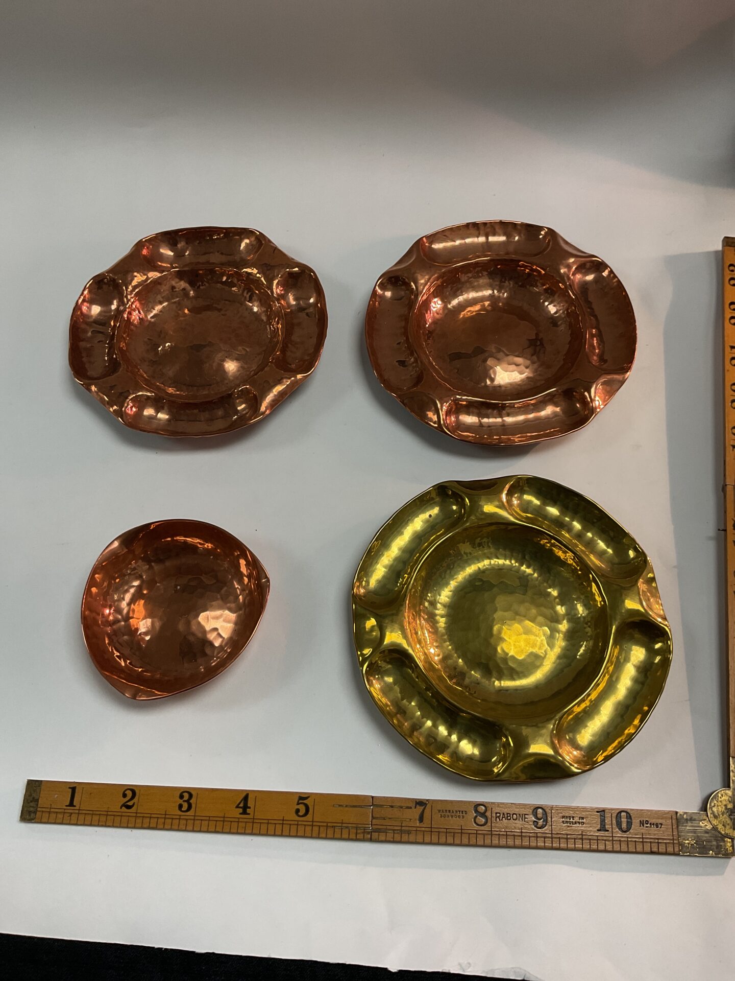 This collection comprises four hand-hammered dishes, three crafted from copper and one from brass. The dishes exhibit the characteristic organic forms and textured surfaces associated with the Arts and Crafts movement. The irregular, slightly raised rims and the visible hammer marks demonstrate the hand-wrought nature of these pieces, suggesting a possible connection to the work of Norman and Ernest Spittale, known for their metalwork during this period. The varying sizes and subtle differences in form add to their individual character.