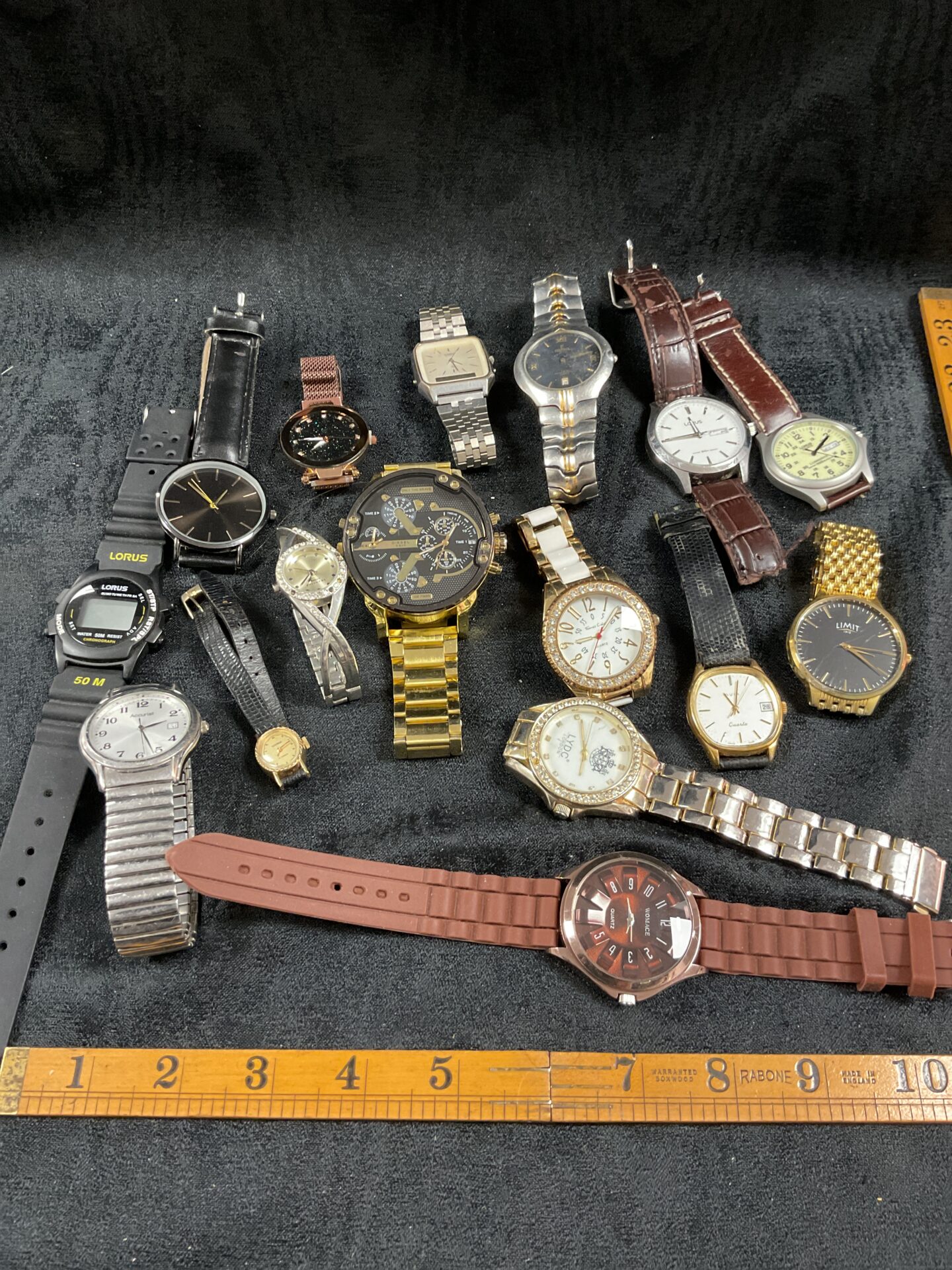 This lot comprises a collection of assorted wristwatches, displaying a variety of styles and designs. The collection includes both men’s and women’s watches, with differing strap materials such as metal bracelets and leather straps. The faces exhibit a range of colours and dial configurations, suggesting a diverse range of eras and manufacturers.