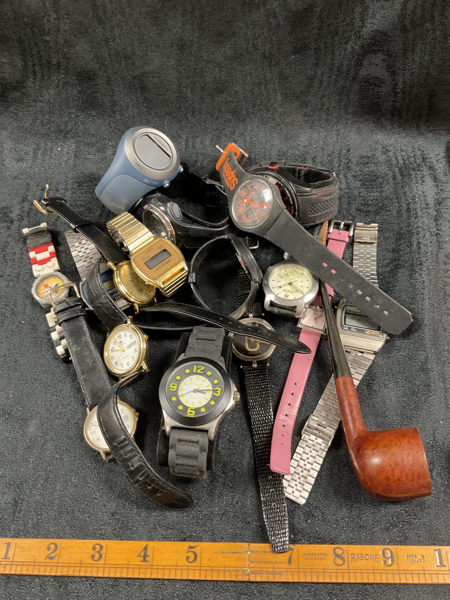 This lot comprises a diverse collection of wristwatches, featuring brands such as Rotary, Lego, and Garmin. The styles range from classic analogue designs to more modern digital displays, offering a variety of aesthetics and functionalities. The collection includes watches with metal and plastic straps, and varying dial colours and features, appealing to a broad range of tastes.