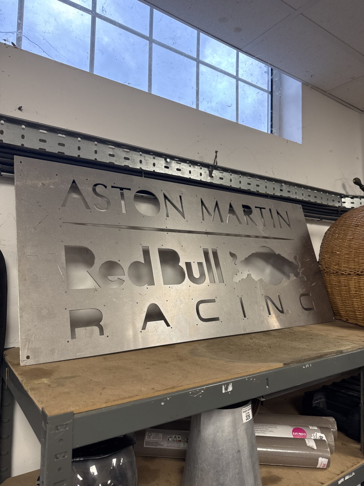 This template shows signs of previous use, with some wear and tear consistent with its purpose. It presents as a unique piece of motorsport memorabilia, appealing to collectors and enthusiasts of Formula 1 and Aston Martin. The template’s size and bold design make it a striking display piece, suitable for a garage, office, or fan cave.