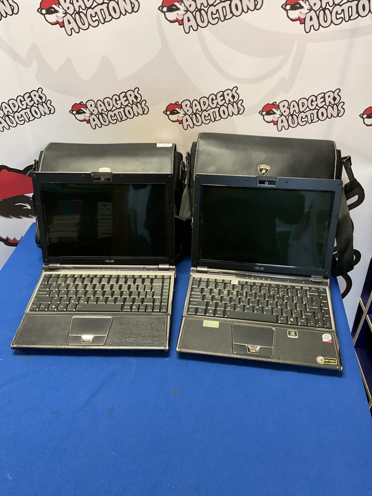 This lot features two Asus Lamborghini-branded laptops, presented with matching black carrying cases. These laptops showcase a striking yellow and black colour scheme, reflecting the iconic Lamborghini aesthetic. The laptops feature the Lamborghini emblem prominently displayed on the lid and chassis, signifying a collaboration between Asus and the luxury automotive brand.