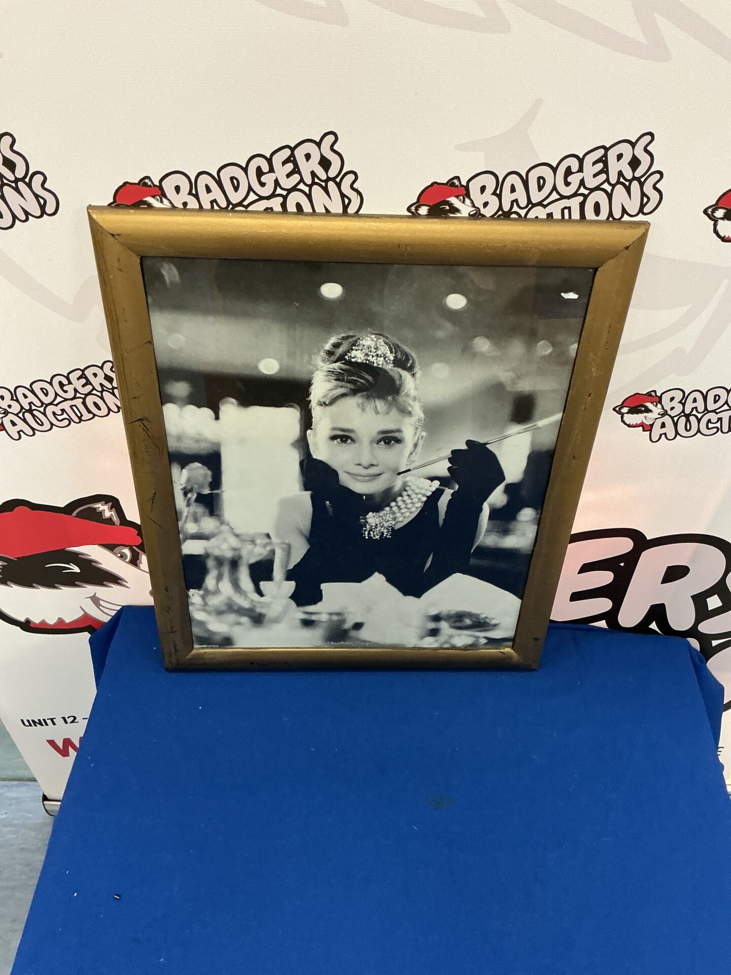 This is a framed black and white print depicting the iconic actress Audrey Hepburn. The print captures a classic portrait of Hepburn, showcasing her timeless beauty and elegance. The frame complements the print, enhancing its visual appeal and making it ready for display.