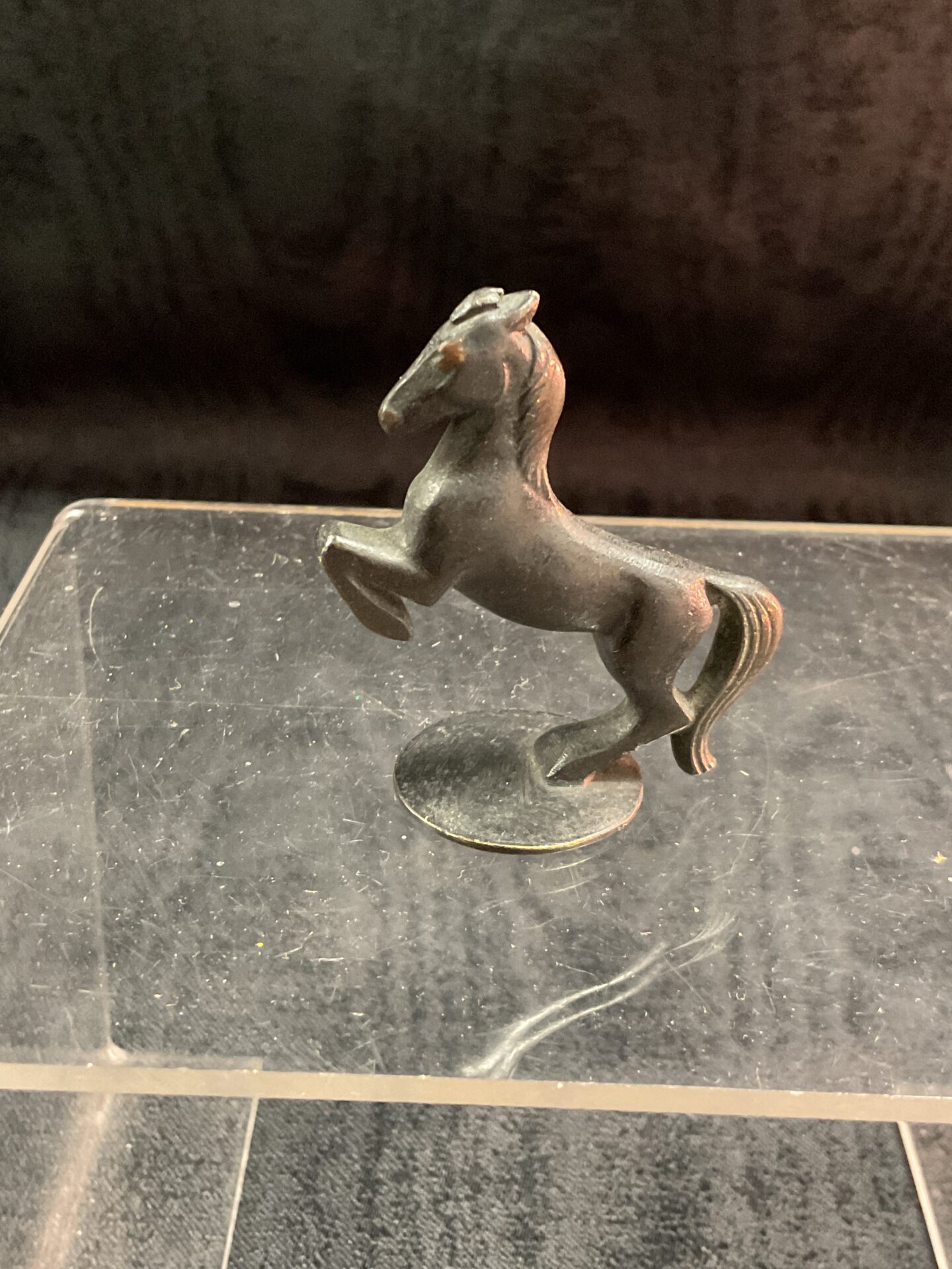 This is a small Austrian bronze sculpture depicting a rearing horse. The piece exhibits a dynamic pose, capturing the animal in a moment of spirited energy. The bronze has a rich patina, suggesting age and careful handling. The sculpture measures approximately 2 inches in height and is a charming example of miniature animal artistry.