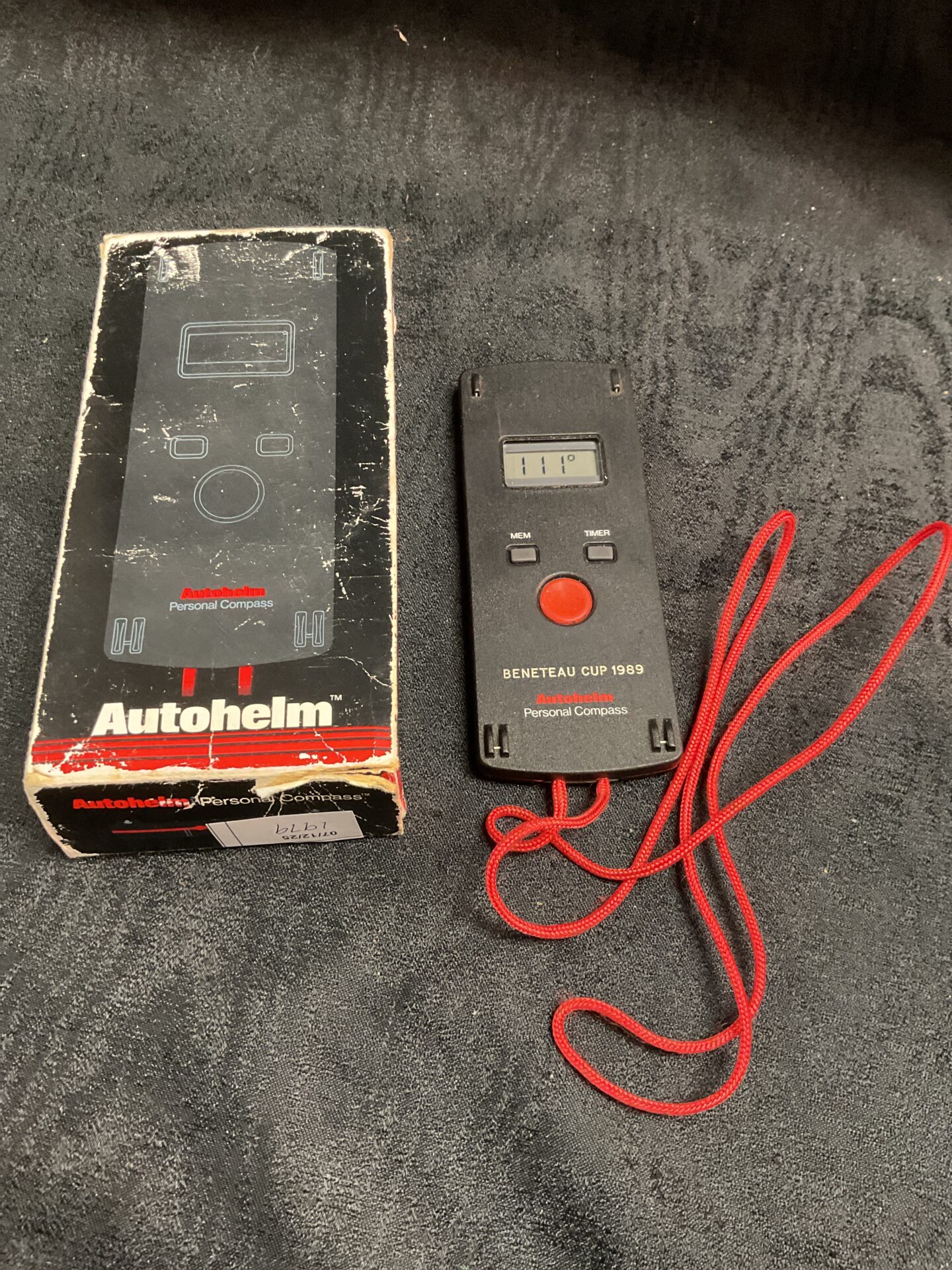 This Autohelm compass appears to be in its original condition, showing signs of use and age. While the functionality is not assessed, it presents as a desirable item for collectors of marine navigation equipment or those interested in vintage technology. Its unique design and historical significance make it a potentially valuable addition to a collection.