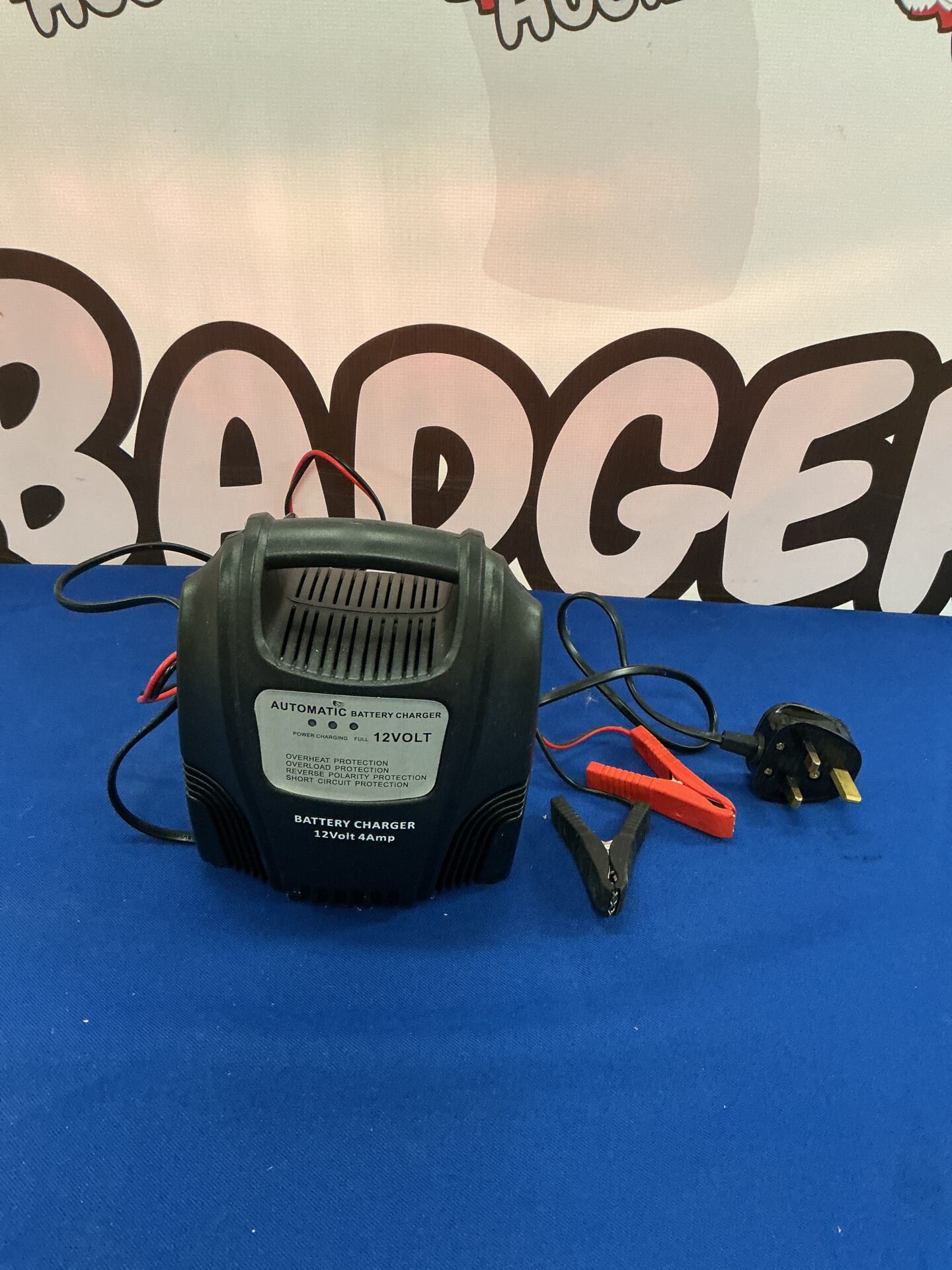 This is an automatic battery charger, designed for 12V vehicle batteries. It features a robust construction and is intended to provide a controlled charge to maintain battery health. The charger is a practical tool for vehicle owners and enthusiasts looking to keep their batteries in optimal condition.