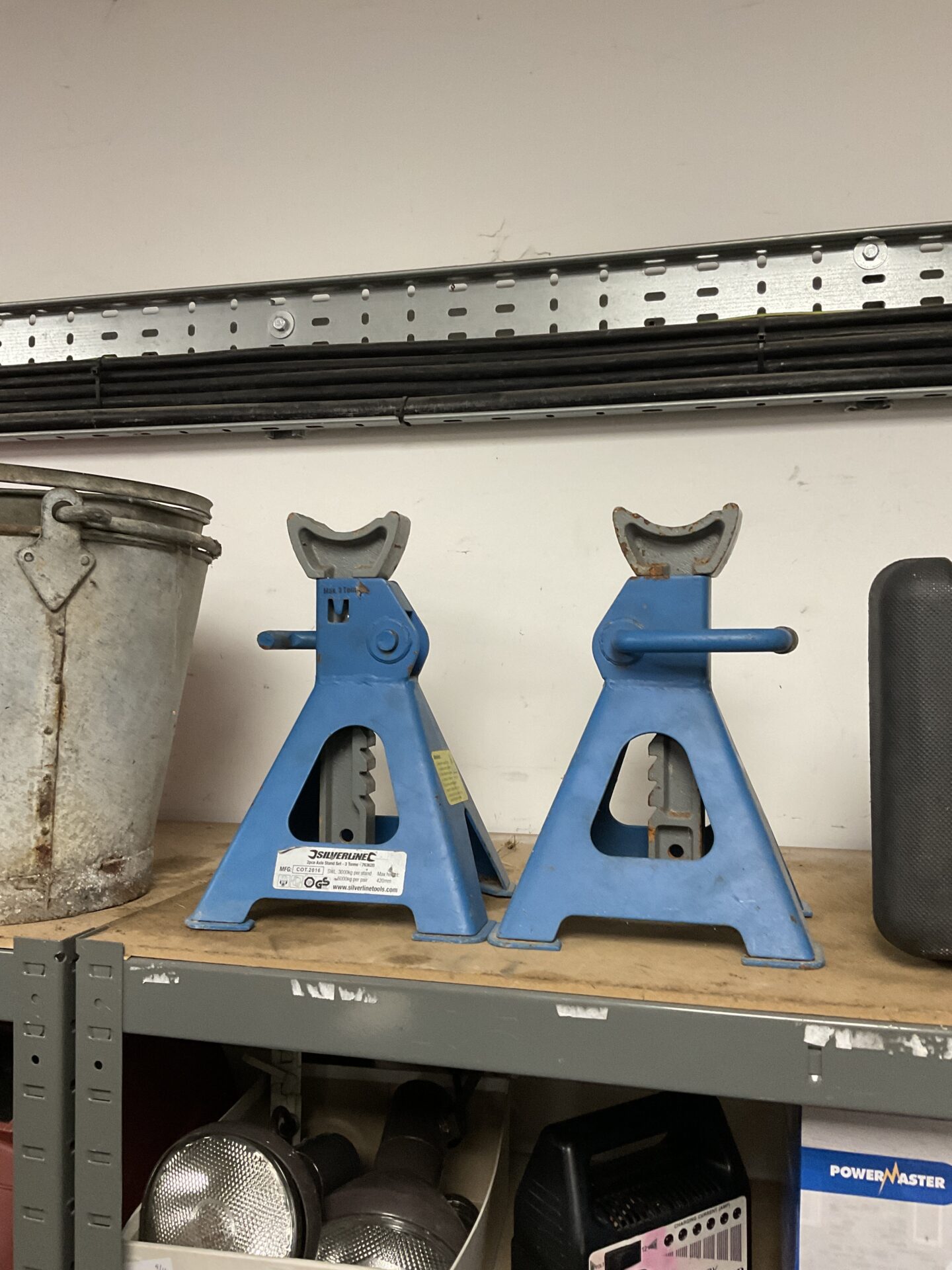 This lot comprises a pair of Silverline 3 ton ratchet type axle stands. These stands are designed to securely support vehicles during maintenance and repair work. The ratchet mechanism allows for adjustable height settings, providing versatility for various vehicle types and working conditions.