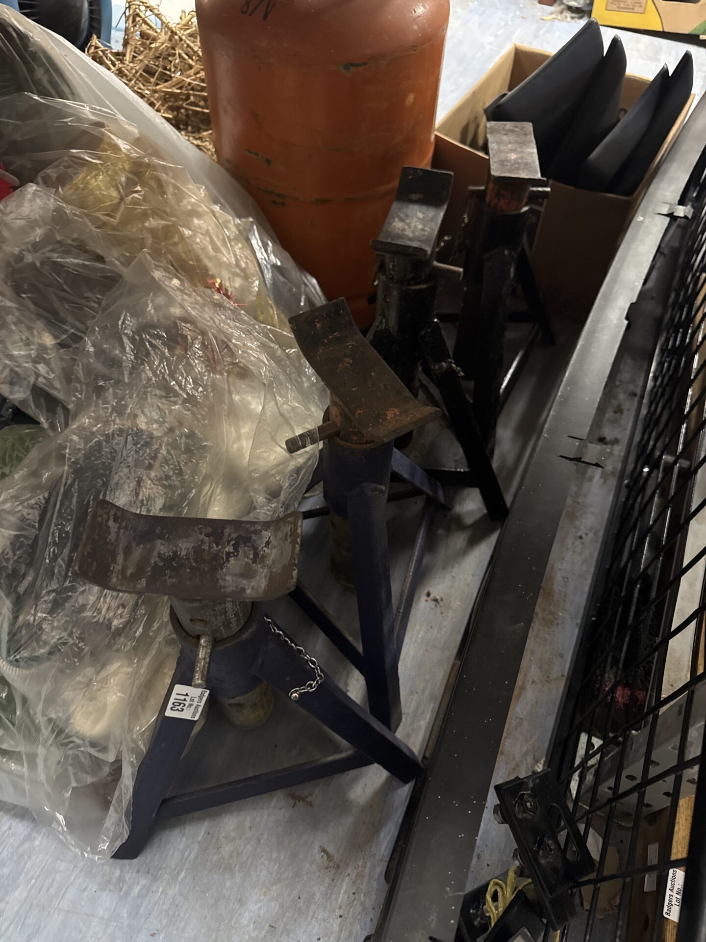 This lot comprises four large axle stands, designed to safely support vehicles during maintenance and repair work. Constructed from heavy-duty steel, these stands offer robust stability and are suitable for a range of vehicle types. Each stand features a pawl mechanism for height adjustment, allowing for secure positioning under the vehicle chassis.