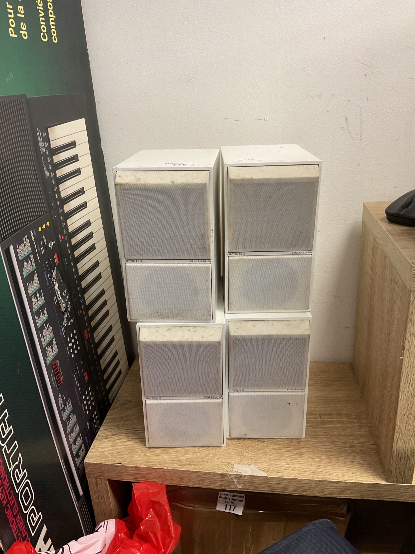 These are four Bang & Olufsen Beovox CX 50 speakers, exemplifying the renowned Danish audio manufacturer’s commitment to quality and design. The CX 50s are compact, two-way bookshelf speakers known for their clear and balanced sound, and were popular in the 1980s. Their minimalist aesthetic, typical of Bang & Olufsen, makes them easily integrated into a variety of interior styles.