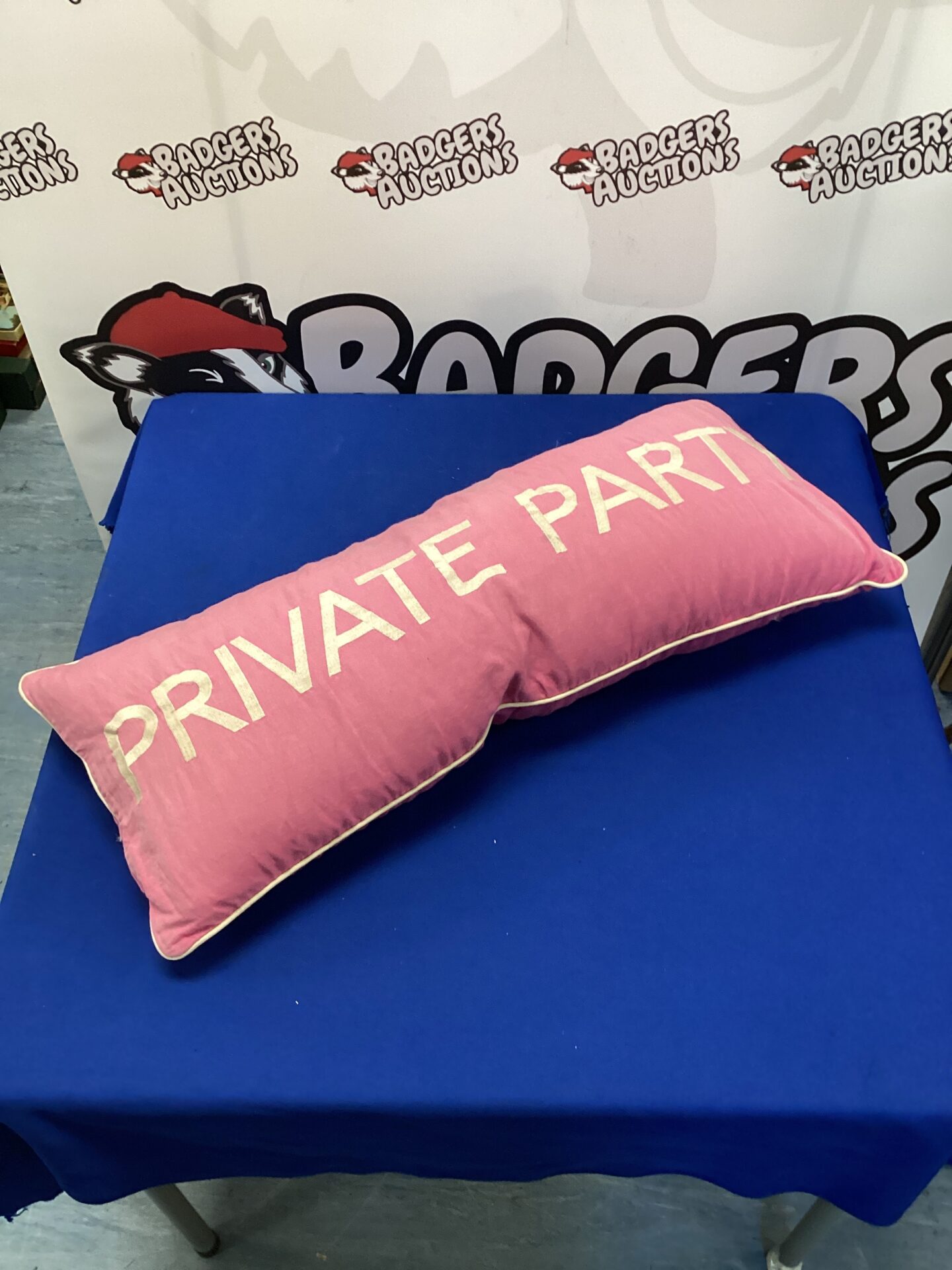 This is a vintage Barbara Coupe “Private Party” pillow. The pillow features a bold pink colour and the words “PRIVATE PARTY” printed across the front. It appears to be a promotional item, likely associated with a specific event or product launch.