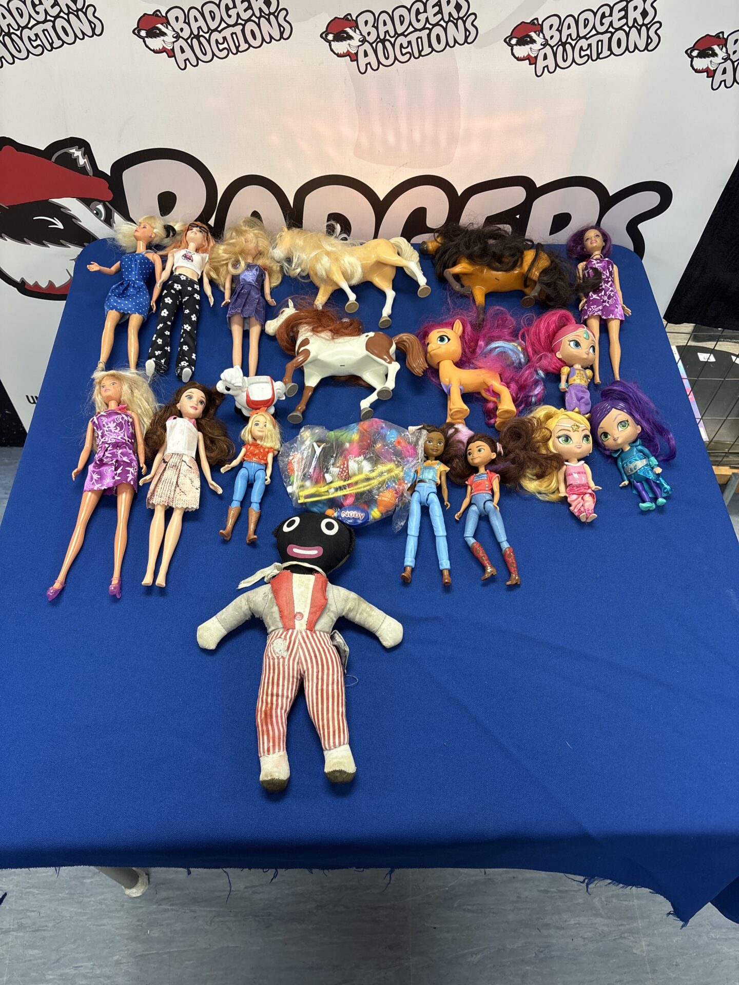 The dolls and horses appear to be in played-with condition, with potential wear commensurate with age and use. The golly doll displays signs of age and may have some minor imperfections. This lot would appeal to Barbie collectors, vintage toy enthusiasts, or those seeking a nostalgic piece of childhood memorabilia.