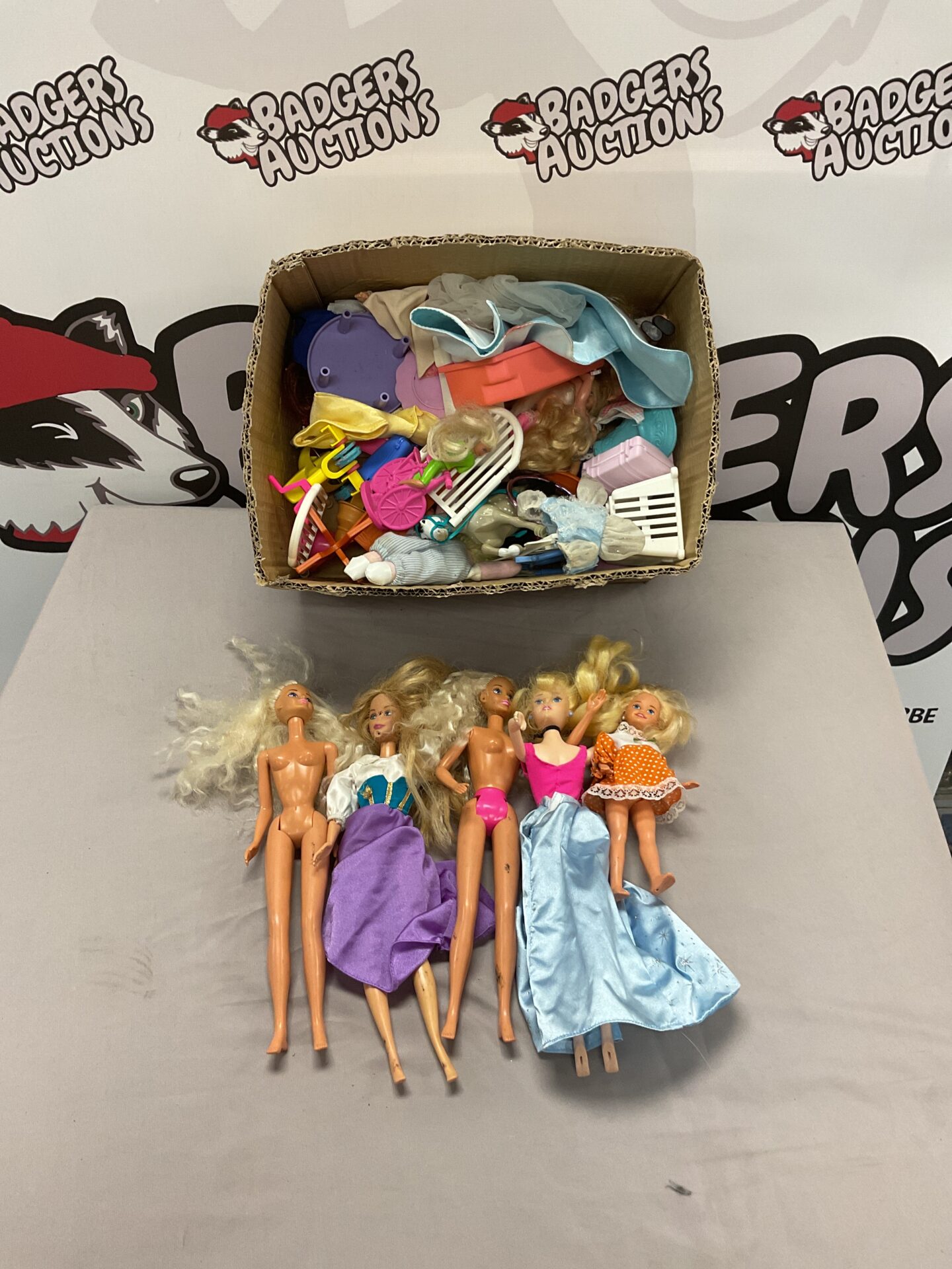The dolls and accessories appear to be in generally good condition, with some expected wear consistent with age and play. This lot is ideal for Barbie collectors, doll enthusiasts, or those looking for a nostalgic piece of their childhood. The variety of items makes it a great starting point for a collection or a fun addition to an existing one.