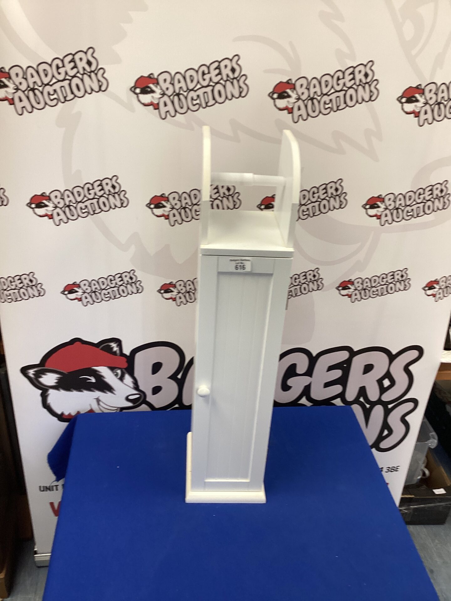 This small, white bathroom wall cabinet offers a practical storage solution for smaller bathrooms. Its compact design and single door provide easy access to toiletries and essentials. A functional and stylish addition to any home, this cabinet is in good used condition.