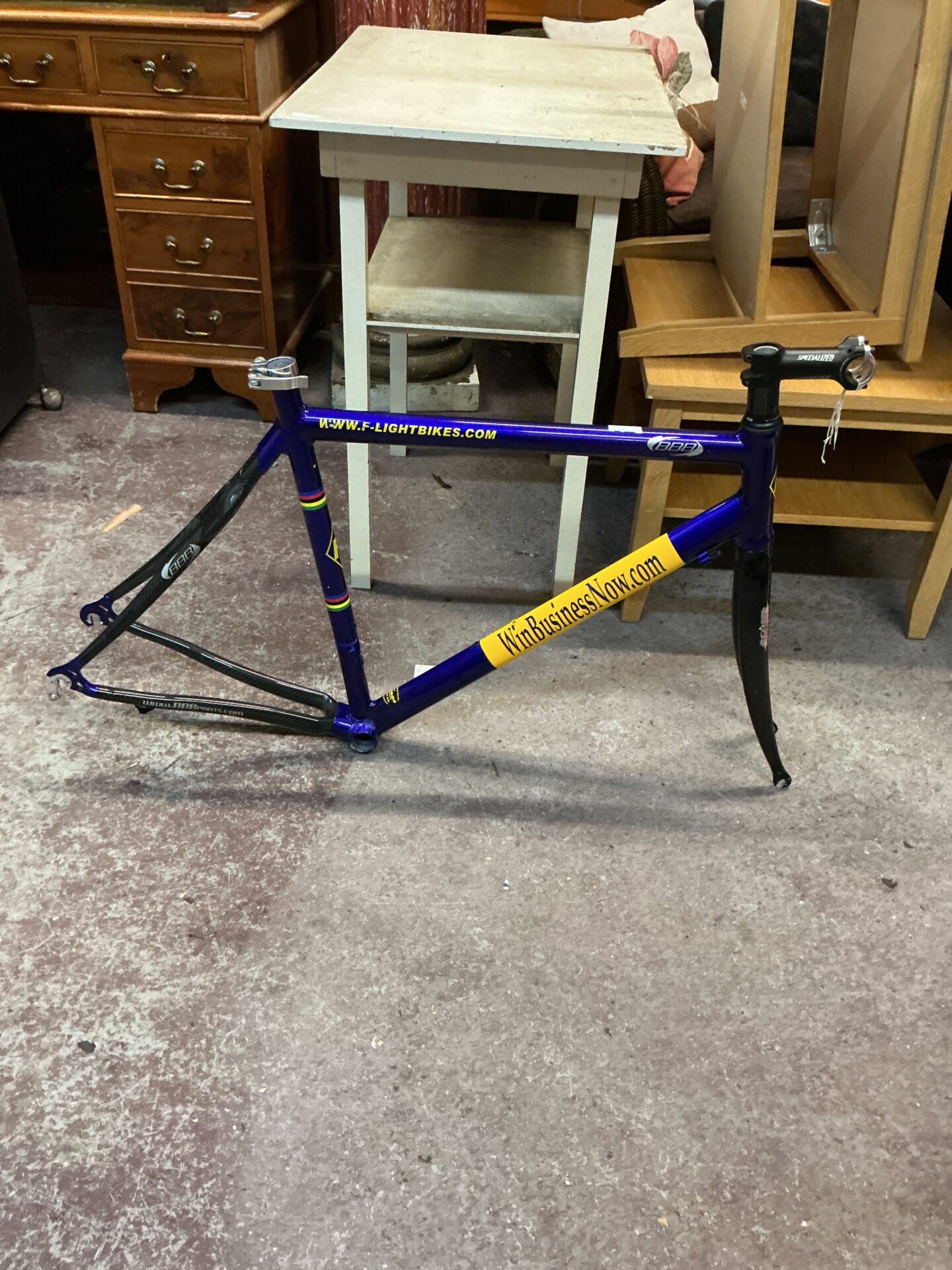 This is a BBB carbon bicycle frame, designed for road biking. The frame features a lightweight carbon fibre construction, intended to enhance performance and speed. It showcases a distinctive blue finish and appears to be a high-quality component for building a custom bicycle.